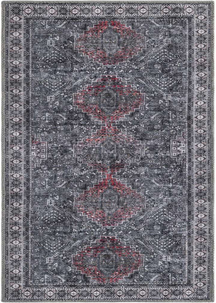 Primary color is Gray. Colors in this rug include: Gray, Black, Ivory, Red.