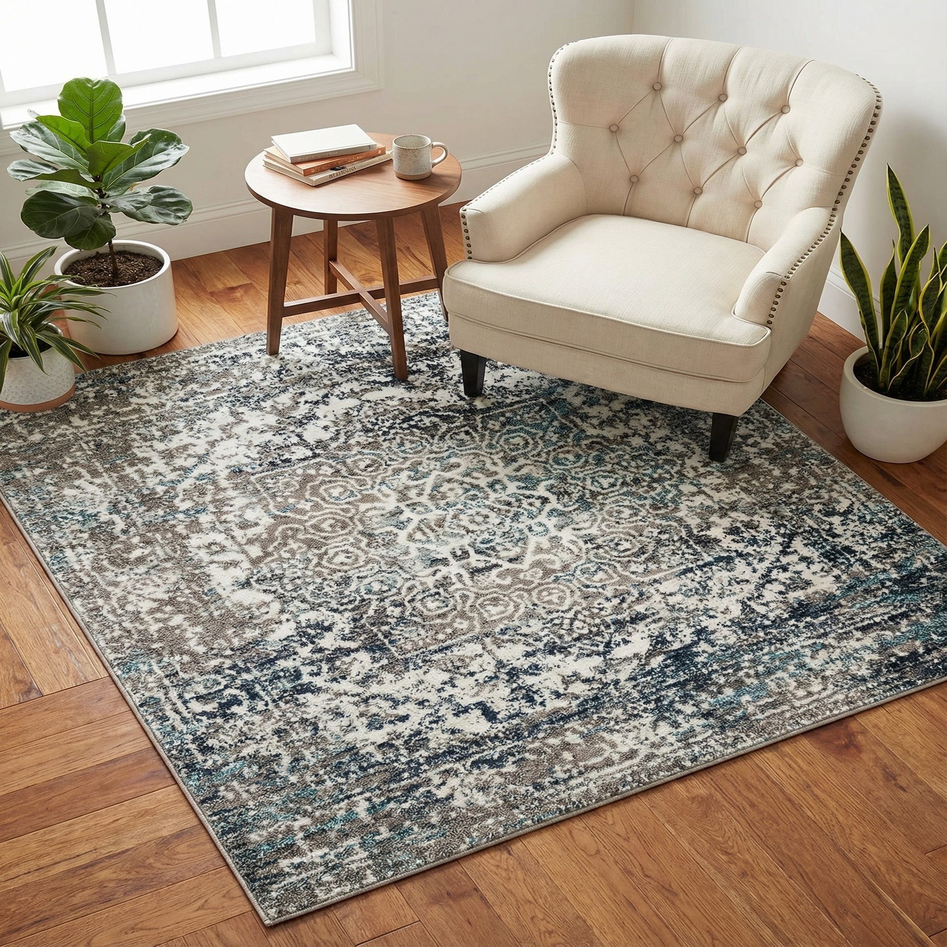 Machine-made from 100% polypropylene, this rug blends a traditional medallion motif with a lived-in, distressed finish for a transitional look that balances classic and contemporary. The gray background provides a neutral field while ivory highlights trace the ornate central medallion and scrolling details. Pops of blue and deeper navy blue animate the surface, creating contrast and depth across the faded pattern. The low, slightly plush pile feels smooth underfoot with a soft, even texture that layers well in a variety of rooms.