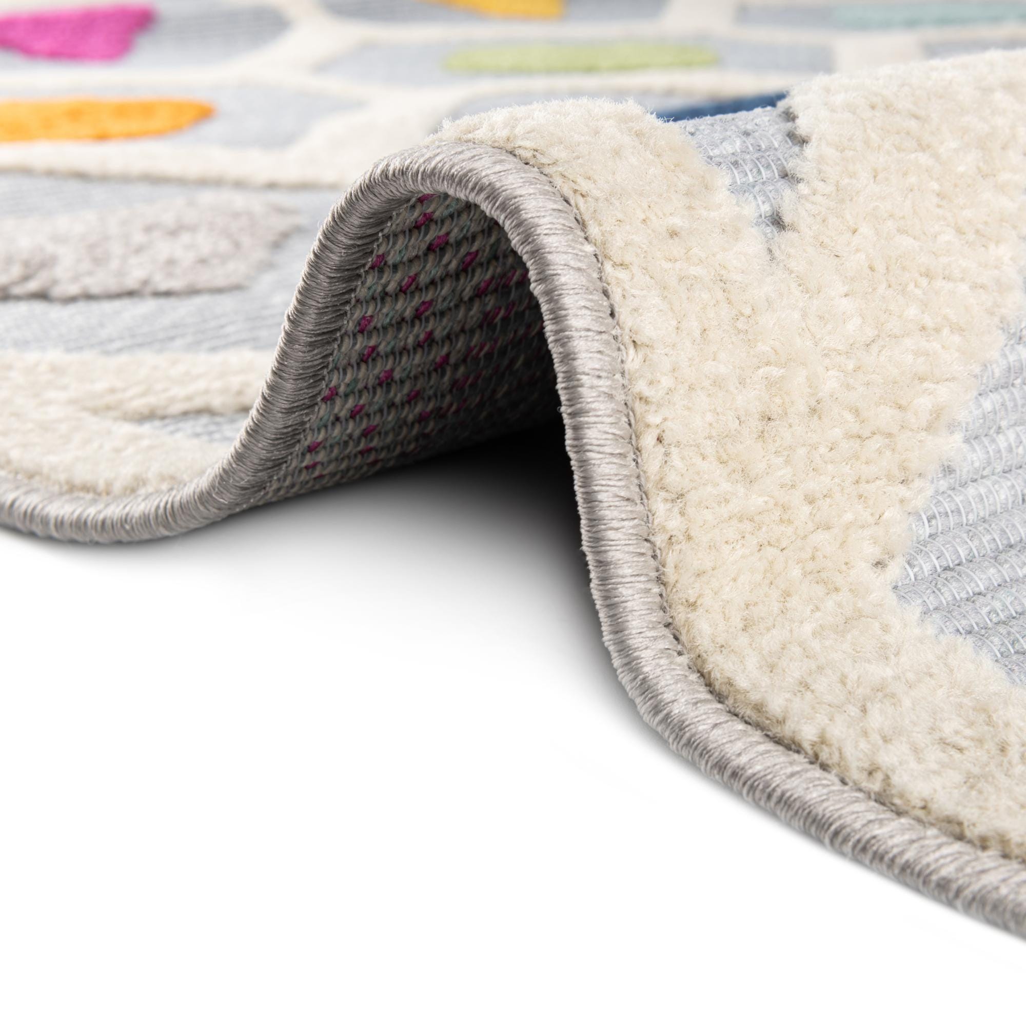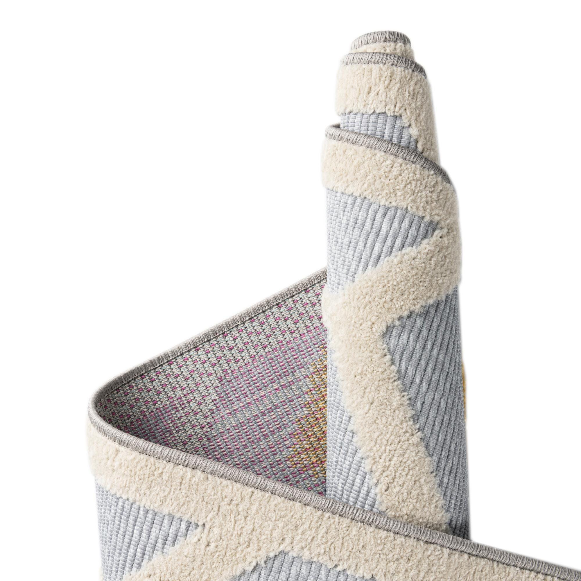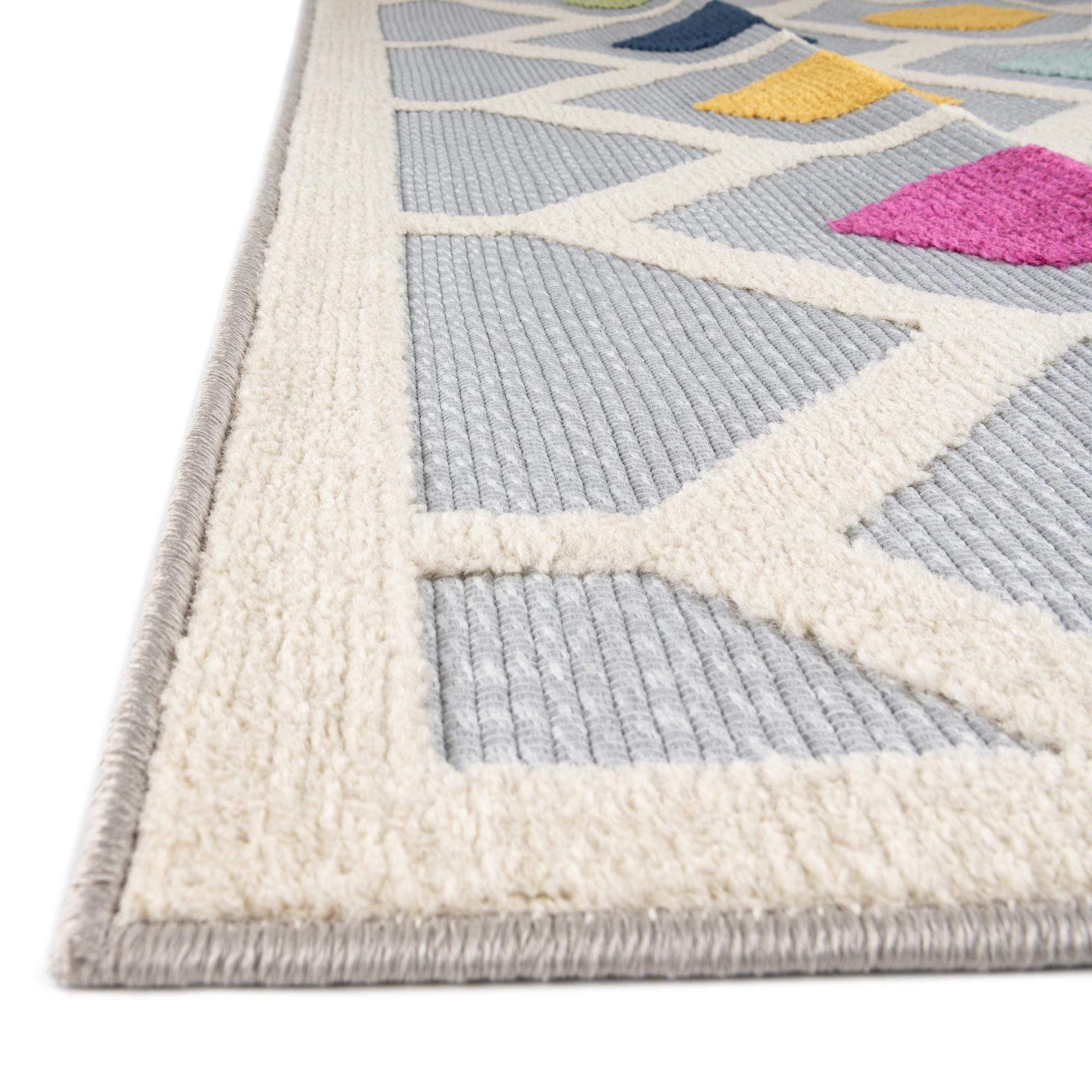 A 5'3" square gray indoor/outdoor rug with a cream trellis pattern and colorful bohemian diamonds in green, blue, yellow, magenta, orange, and gray.
