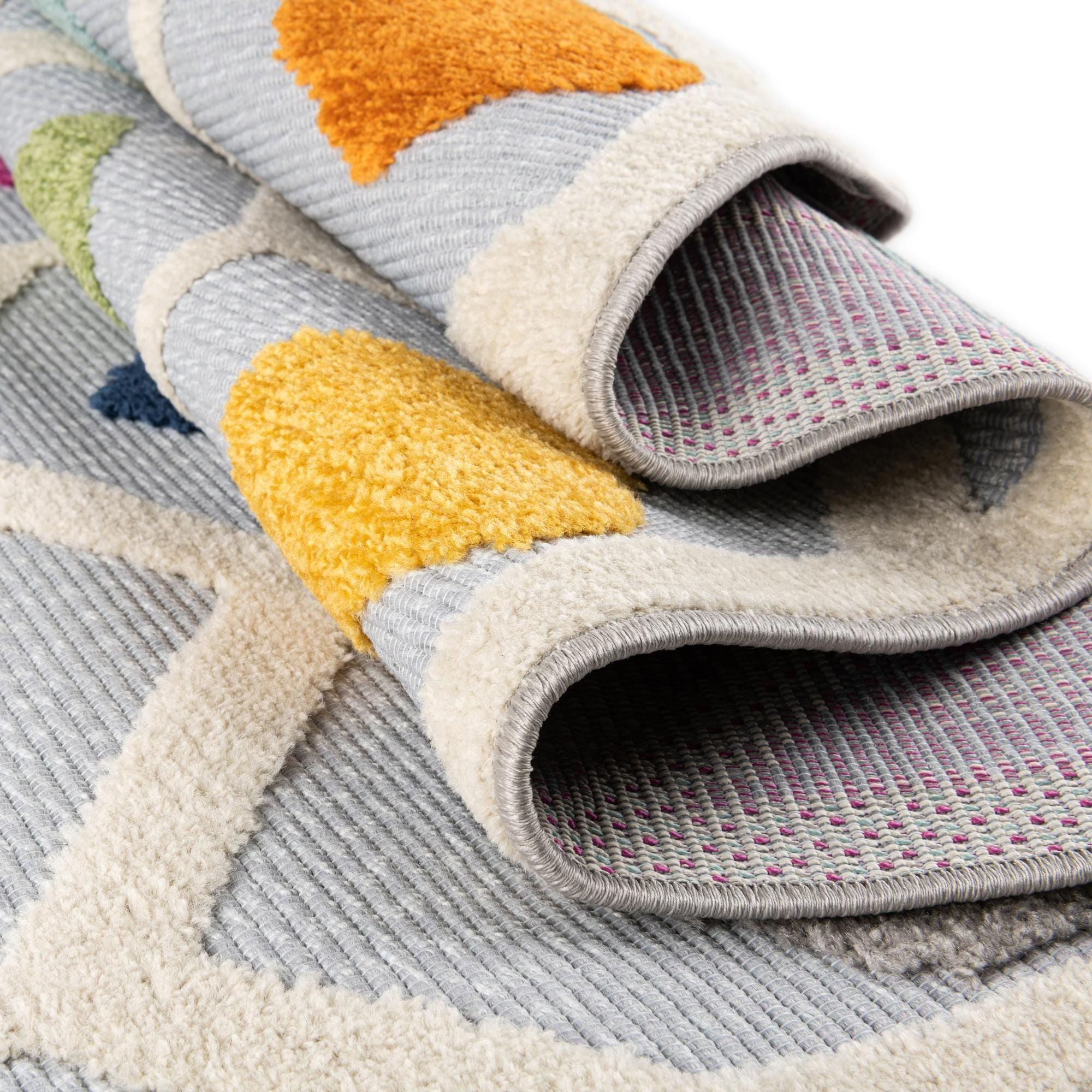 Primary color is Gray. Colors in this rug include: Gray, Gold, Ivory, Light Blue, Light Green, Navy Blue, Pink, Orange.