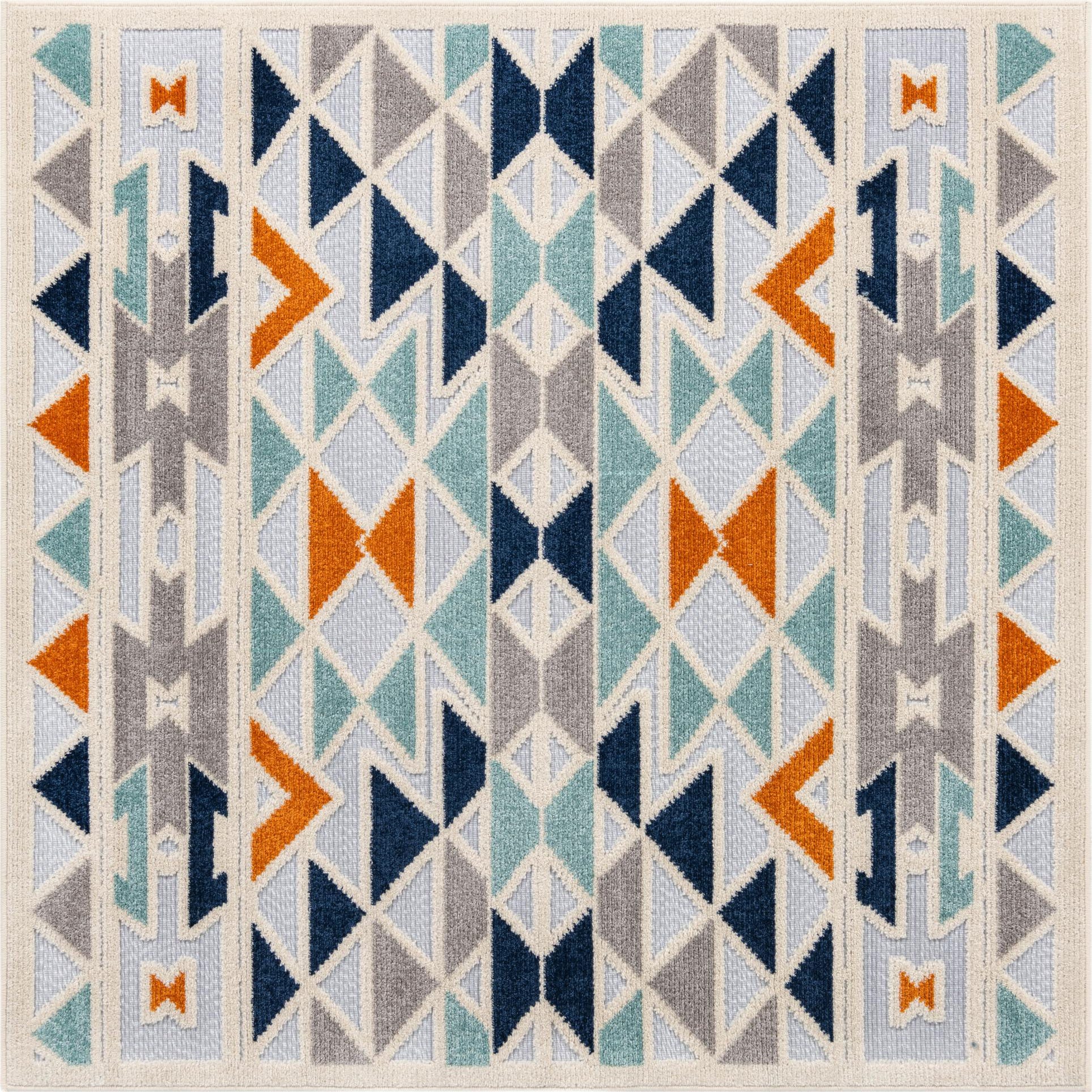 A square 5'3" x 5'3" Aruba Outdoor rug with a vibrant tribal geometric pattern in shades of gray, silver, navy blue, teal, and orange, perfect for an indoor or outdoor patio.