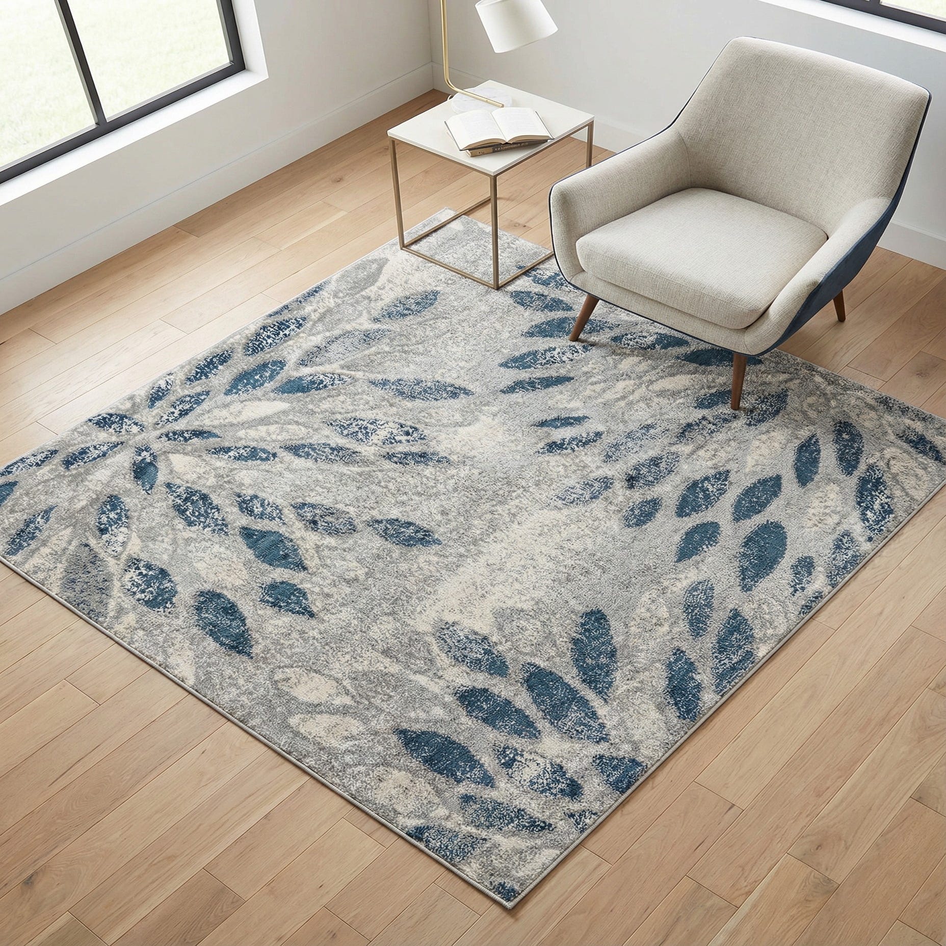 The Charleston collection rug presents a modern, artistic flair with its dynamic pattern. Machine woven of 100% polypropylene, this 5 Ft Square rug showcases an abstract design that mimics organic shapes reminiscent of leaves or flower petals. The palette is a tasteful combination of gray, navy blue, and ivory, with the gray background ensuring versatility and a contemporary feel. The surface texture is smooth, complementing the rug's visual depth and providing a comfortable underfoot experience.
