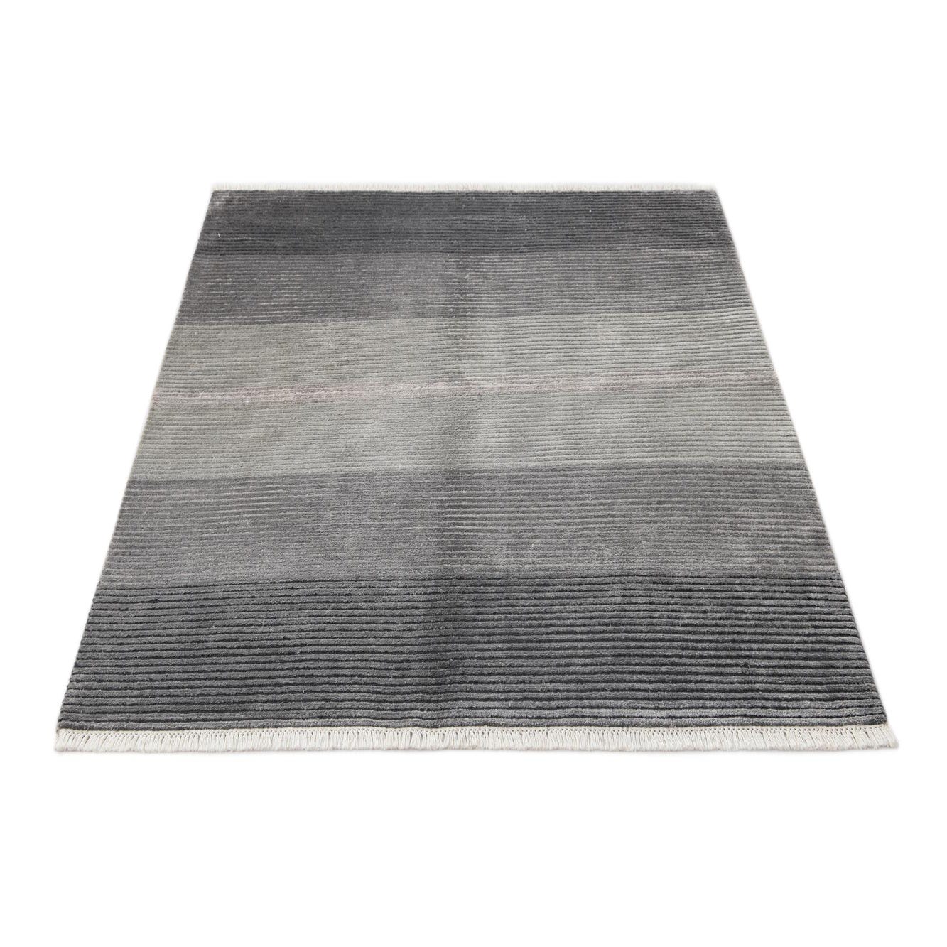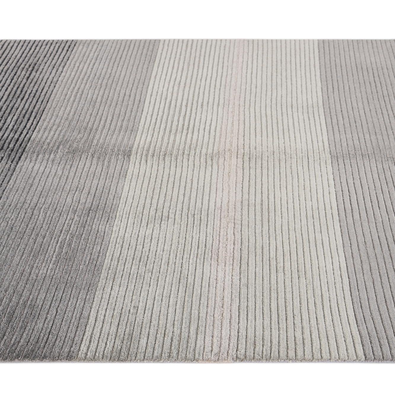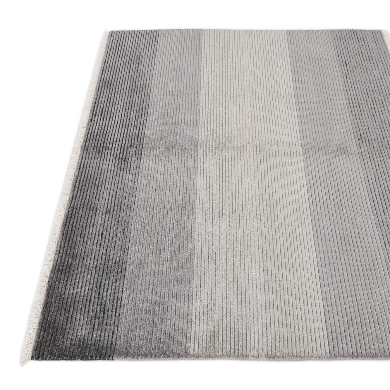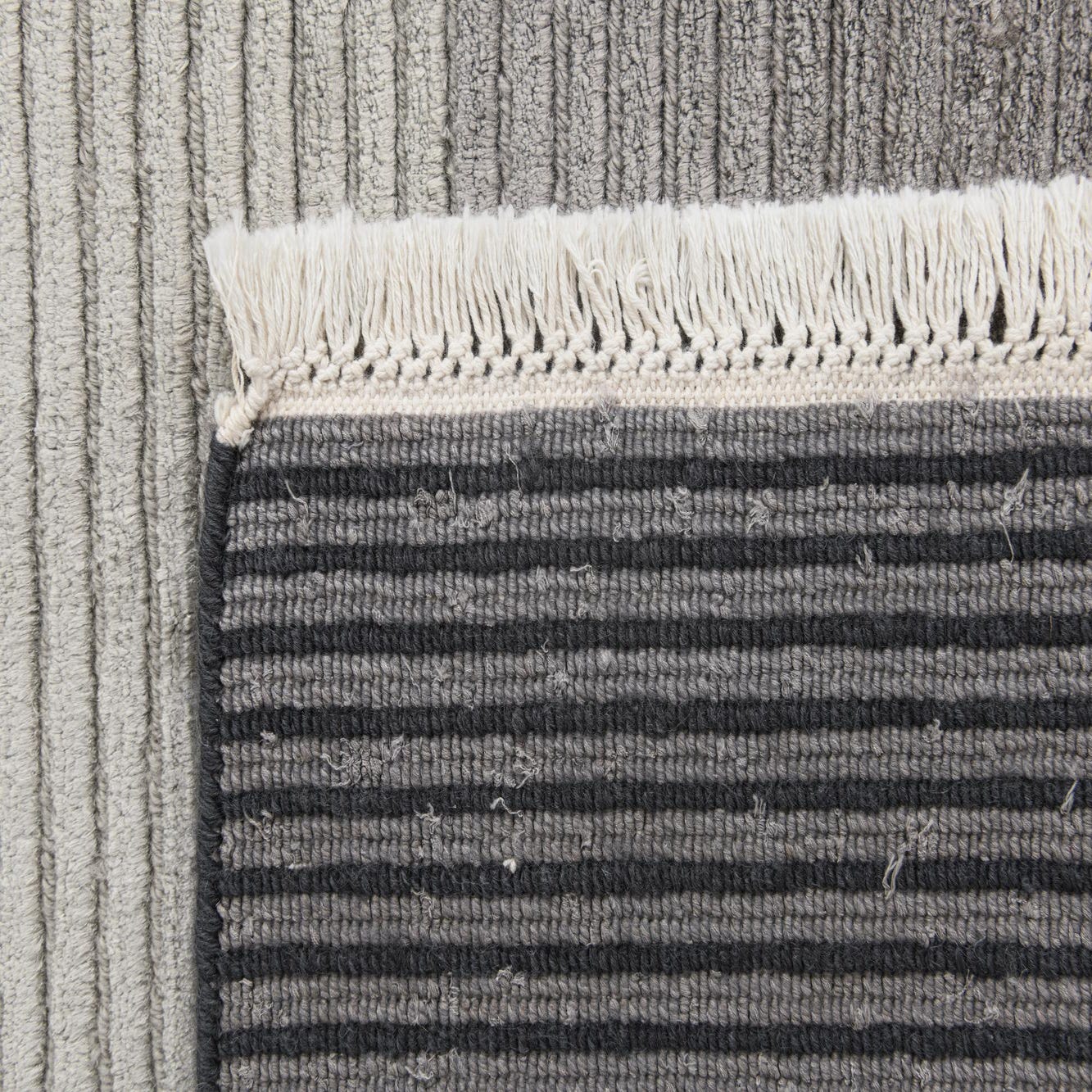Hand-knotted of 100% wool, this rug presents a calm, contemporary look built from fine horizontal ribs that run across the field. The gray background acts as a neutral foundation, punctuated by deeper gray-to-black bands at the edges and subtle silver highlights woven through the pile. The narrow ribbed construction creates a tactile, low-profile surface that feels soft underfoot, while the short fringed edges provide a restrained, finished detail.
