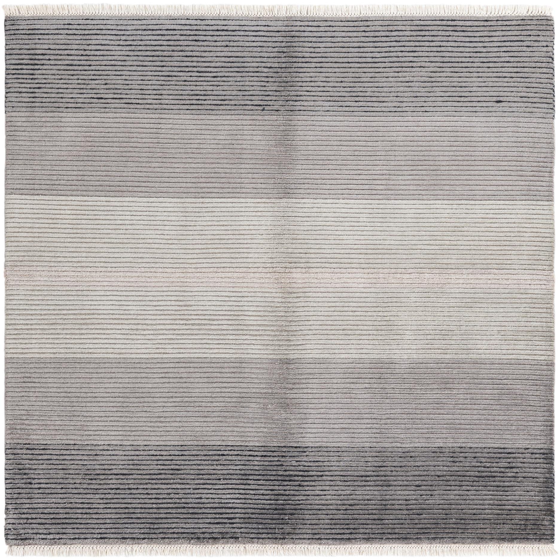 A square 4'11" x 5'1" Darya rug featuring horizontal stripes in varying shades of gray, with a high pile and fringe.