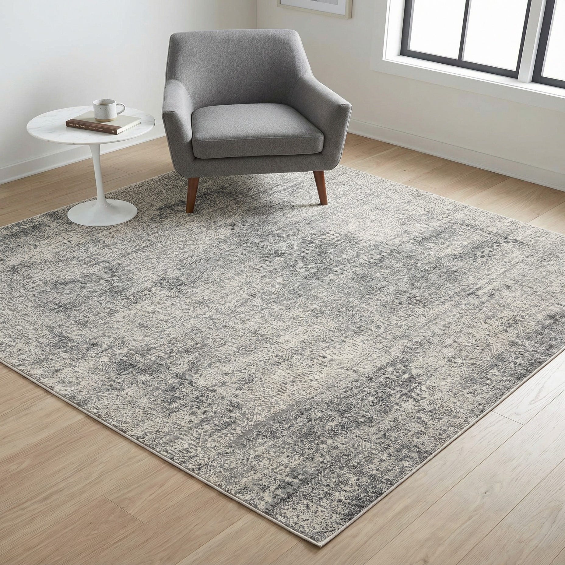 A softly distressed, vintage-inspired pattern gives this rug a lived-in look where ivory motifs drift across a gray background. The design blends subtle ornamental and geometric elements into a low-contrast, aged effect that works as a neutral anchor without dominating the room. Tonal variations of gray and ivory create depth and visual texture while keeping the overall palette calm and versatile.