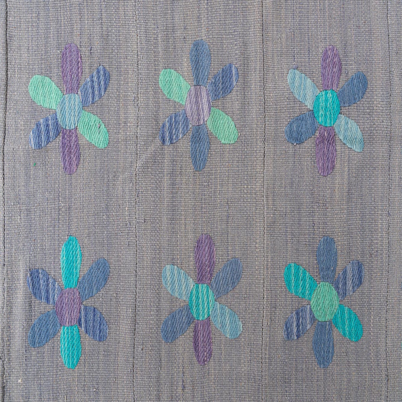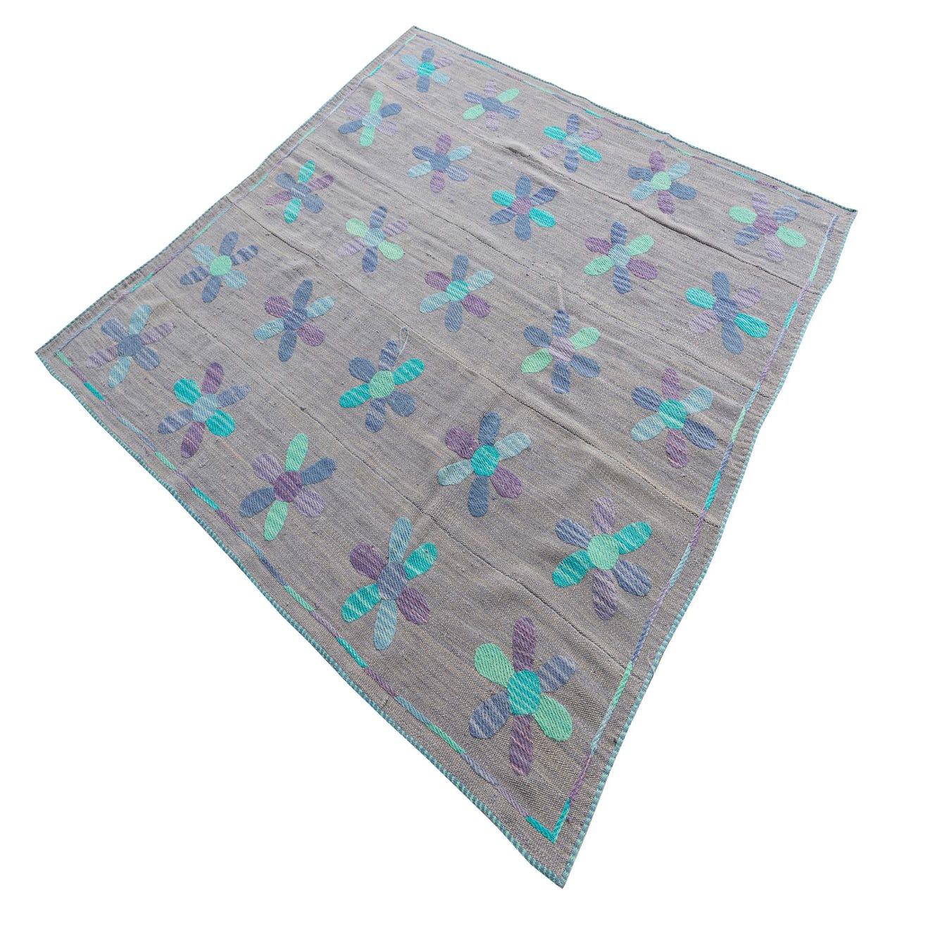 A 5' 4 x 5' 5 square gray flatweave wool rug with a repeating pattern of colorful tribal flowers in blue, purple, and teal.