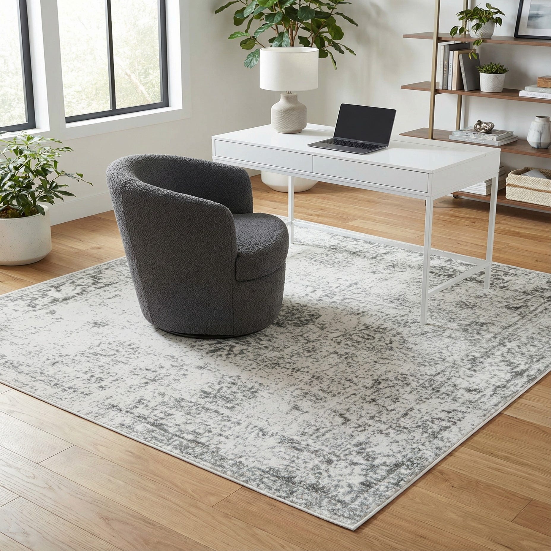 This neutral palette and understated pattern work well in contemporary and transitional rooms where you want a calm foundation: anchor a seating area in the living room, add warmth at the foot of a bed, or soften a home office. Pair it with light wood furniture and linen upholstery for a Scandinavian or coastal vibe, or layer with darker metals and leather for a modern farmhouse or urban contemporary look.