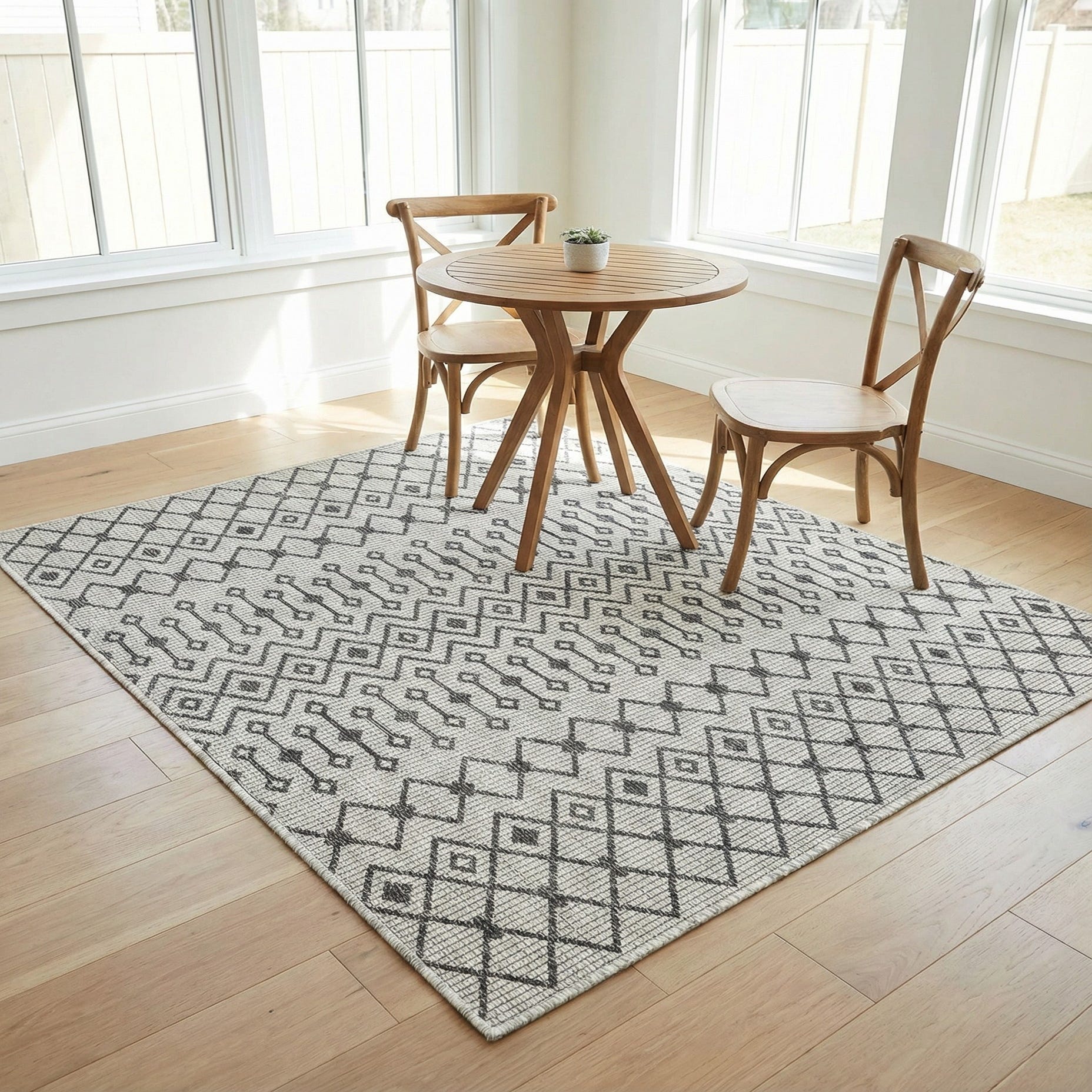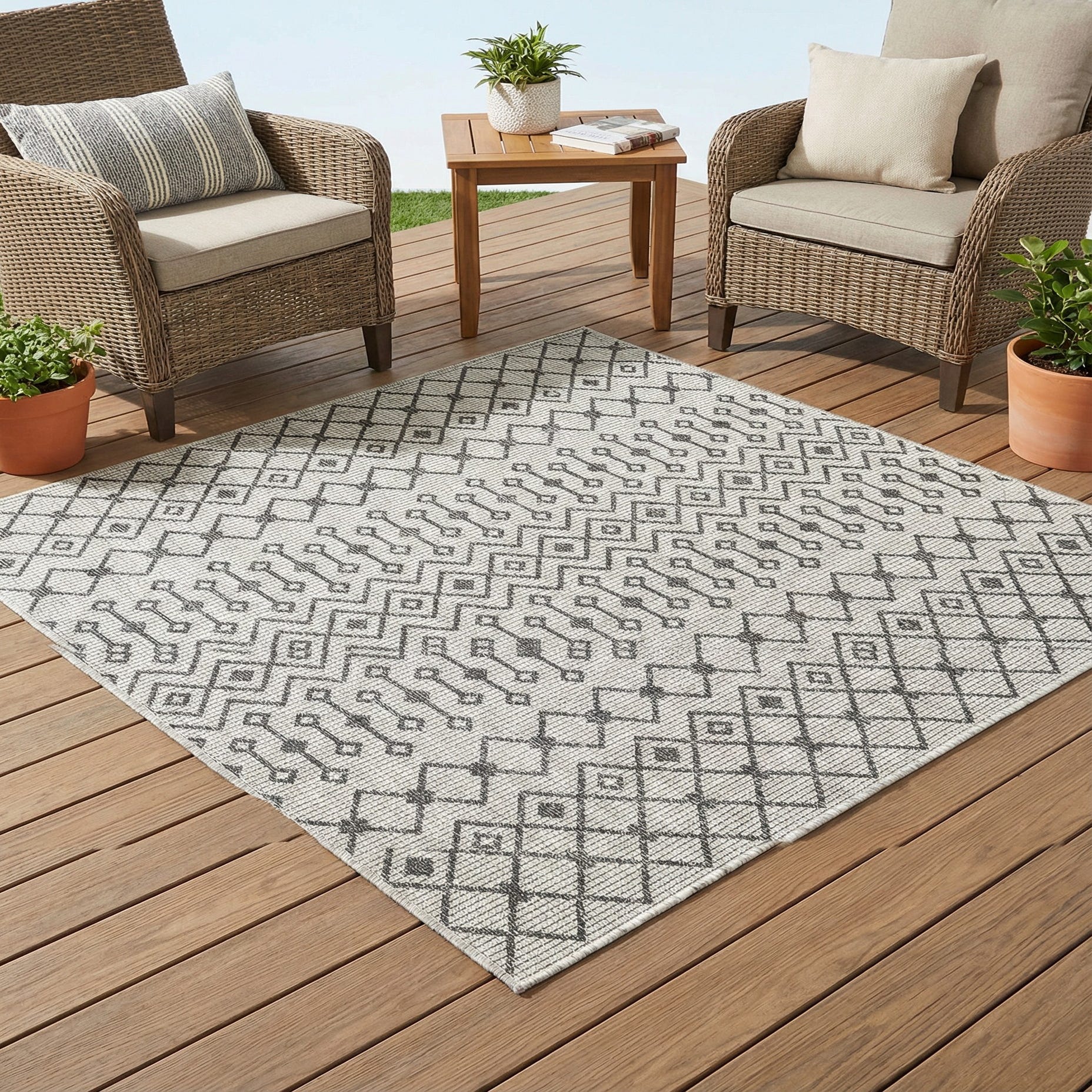 The neutral gray and black palette fits a wide range of settings: place it on a covered patio beneath a metal-framed seating group and warm wood accents, anchor a casual dining area on a screened porch, or add contrast to a contemporary living room with light upholstery and concrete or wood floors. The flat weave and structured pattern also make it a practical choice for hallways, entryways or sunrooms where you want graphic interest without extra height.