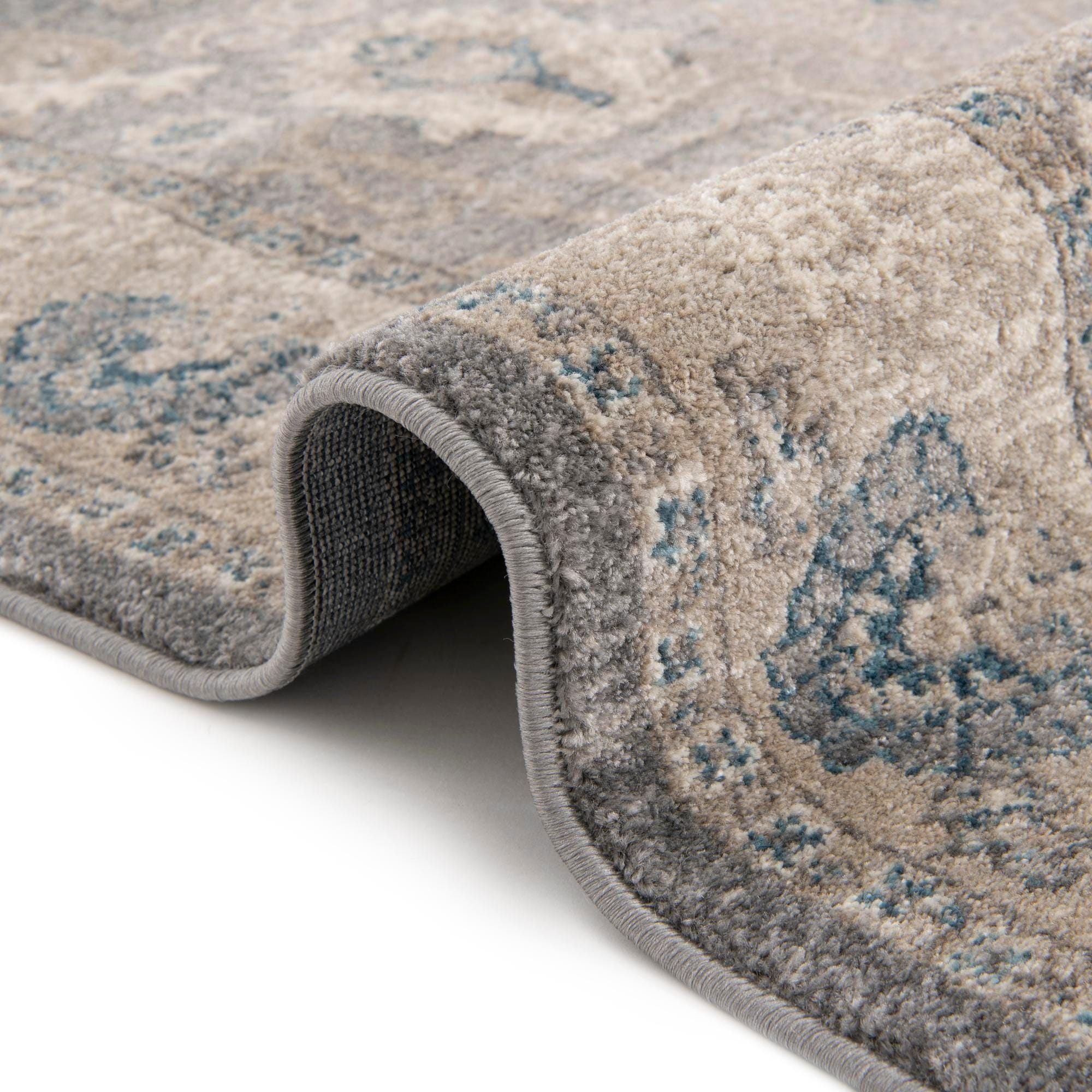 Primary color is Gray. Colors in this rug include: Gray, Light Blue, Ivory.