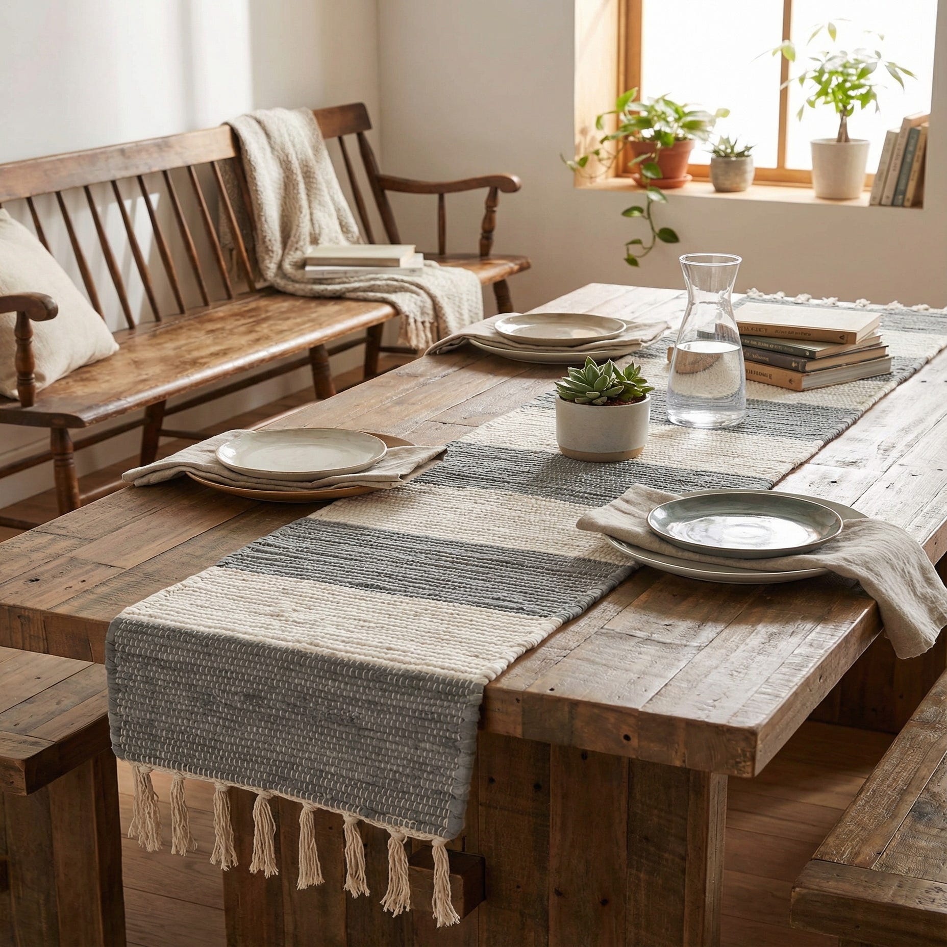 This simple stripe works well as a table or console runner, dresser scarf, or layered over a larger rug for added texture. It pairs naturally with neutral palettes, bleached or weathered wood, and metal accents, fitting styles from Scandinavian and coastal to modern farmhouse and casual contemporary. Use it to anchor tabletop arrangements or to introduce soft texture in an entryway or kitchen.