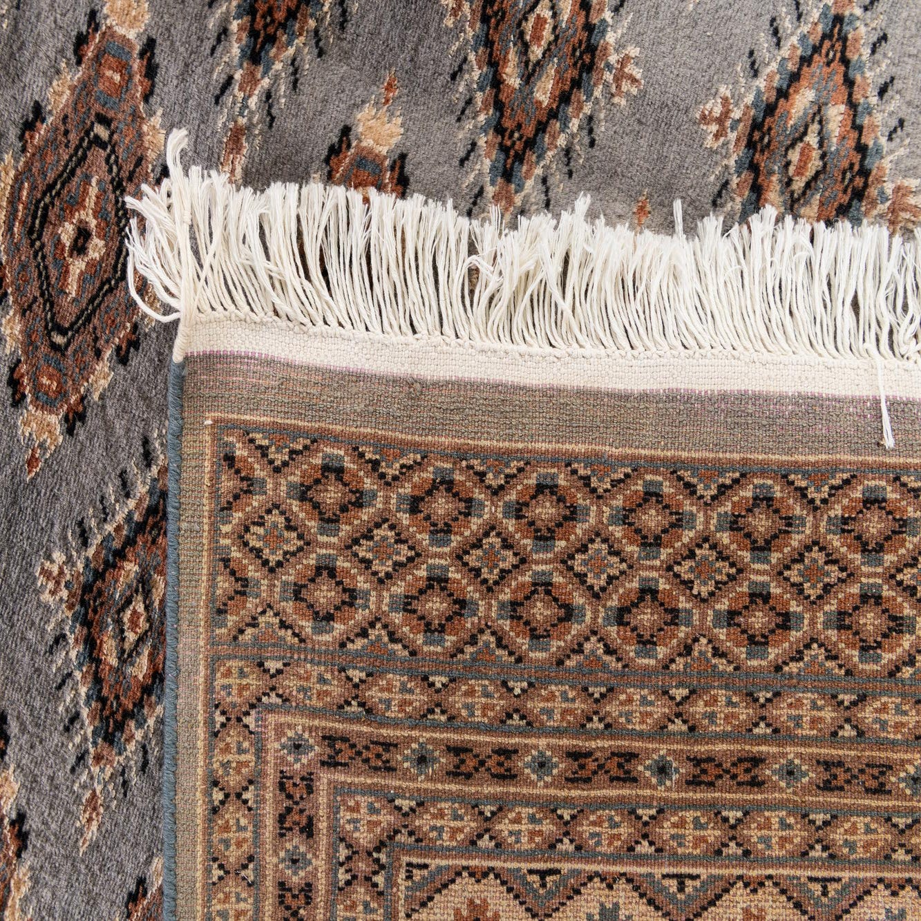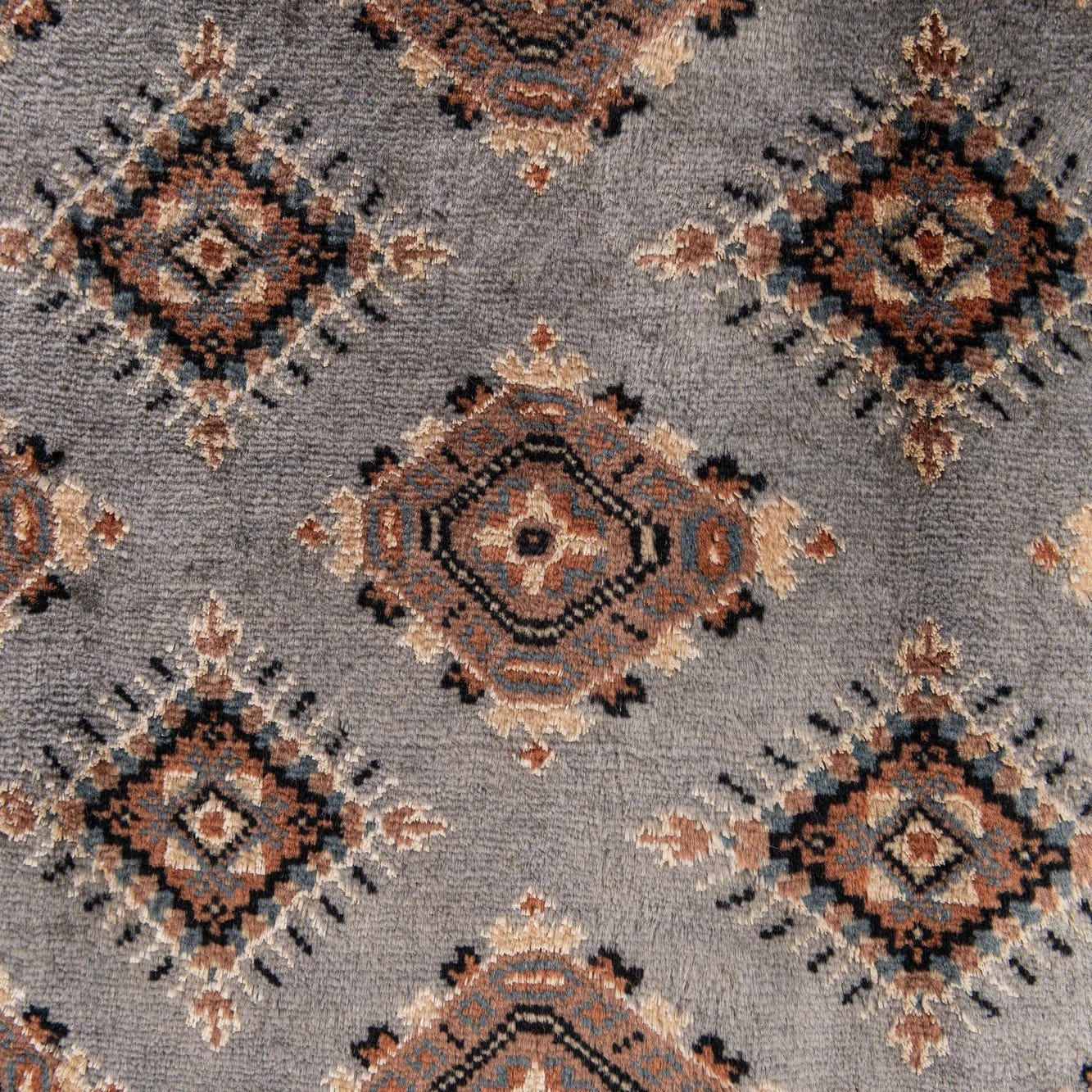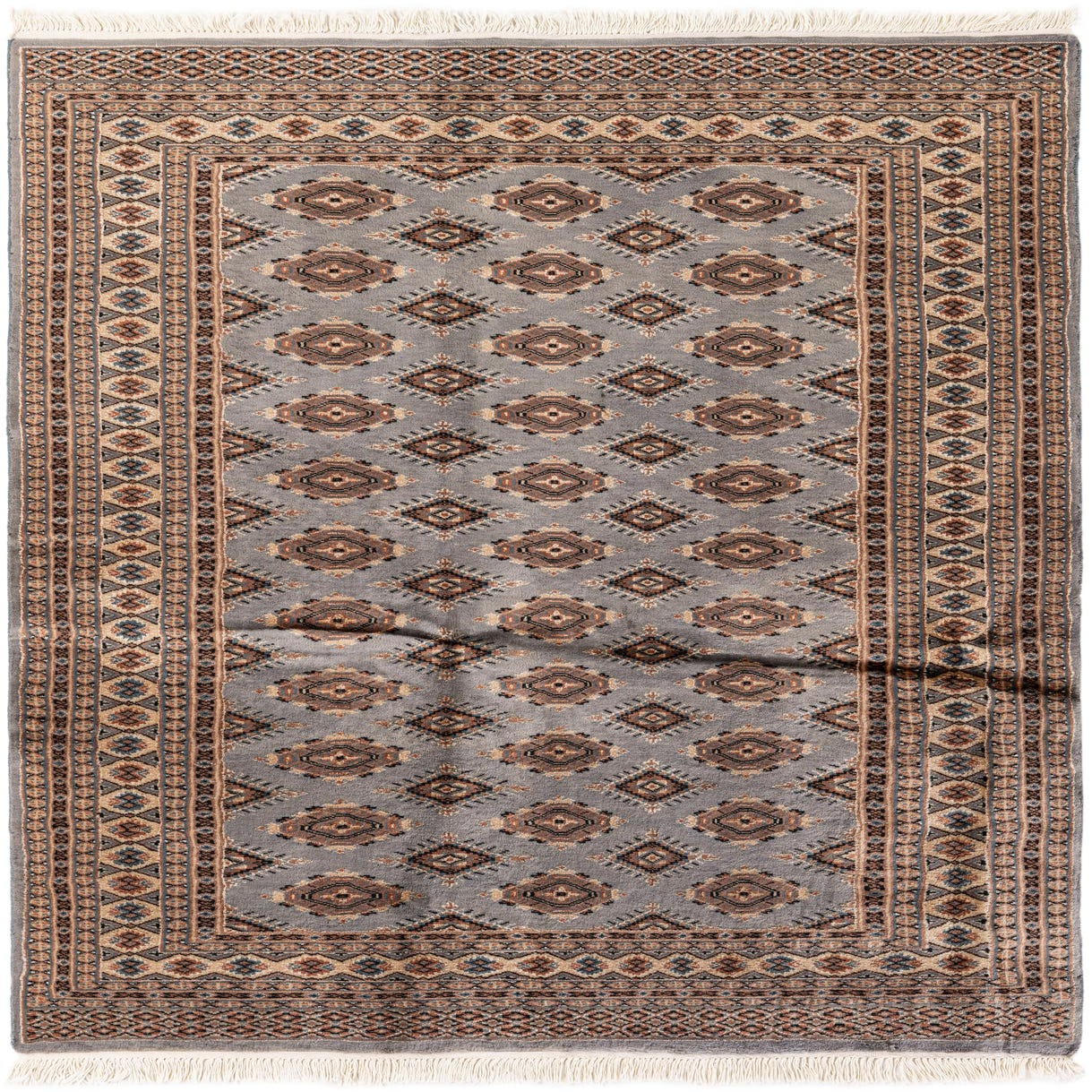 A 5x7 rectangular gray Bokhara wool rug with a traditional tribal pattern and fringed ends, suitable for indoor use.