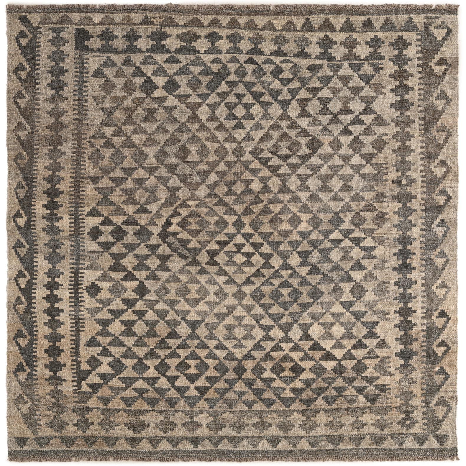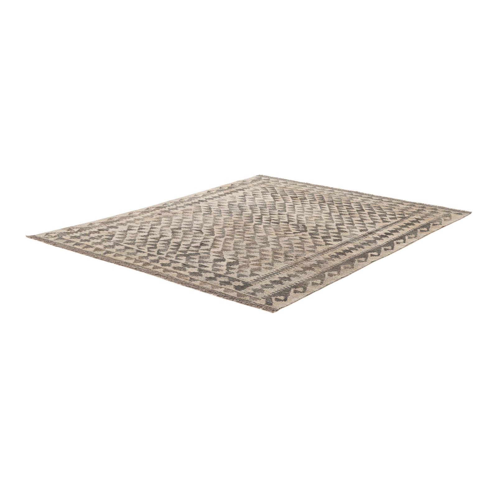 A 5x7 rectangular gray and silver tribal flatweave rug with a geometric pattern and decorative border.