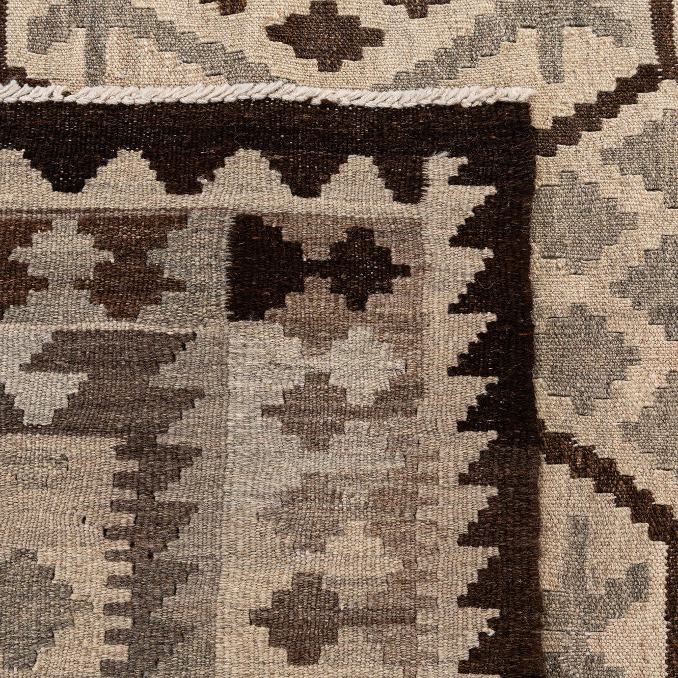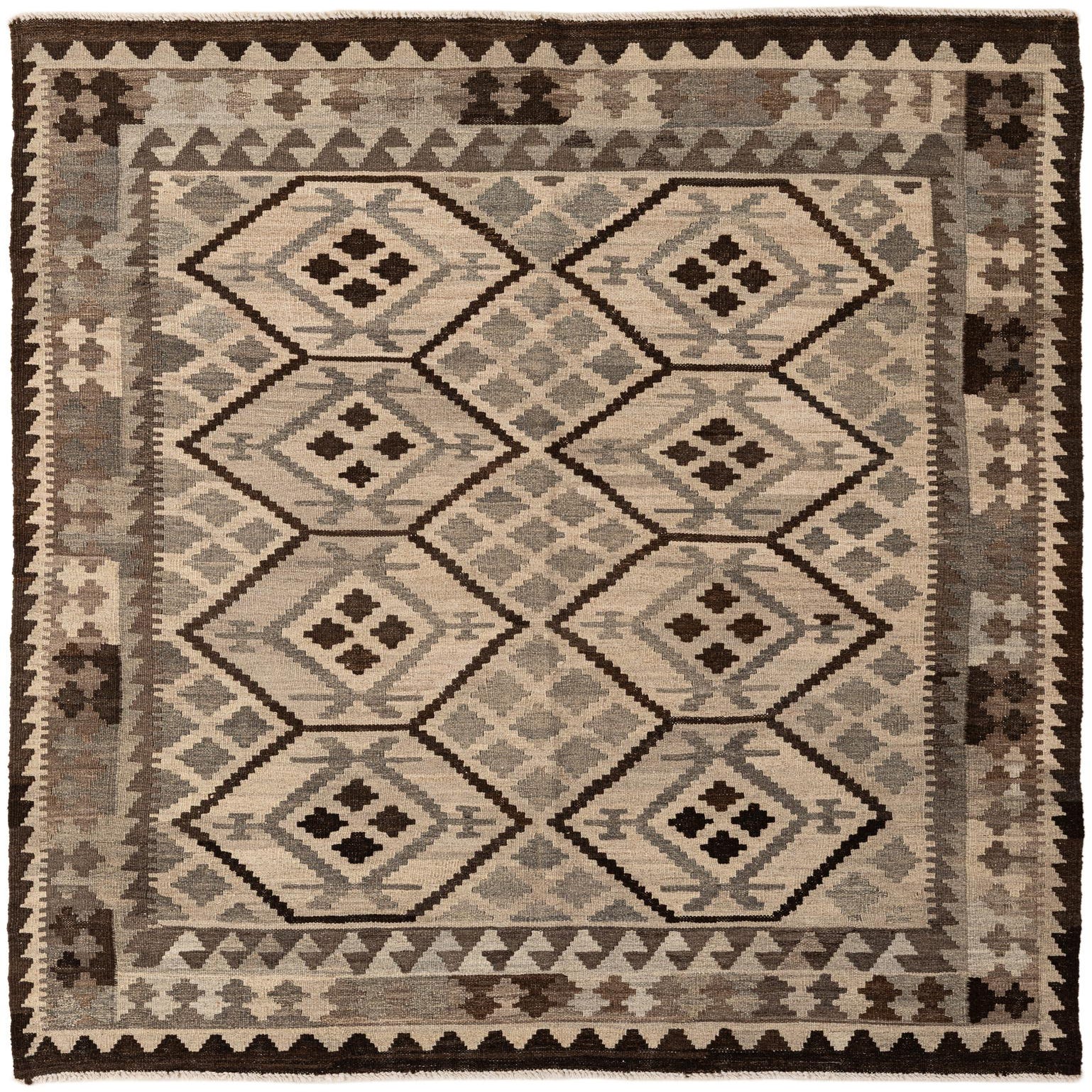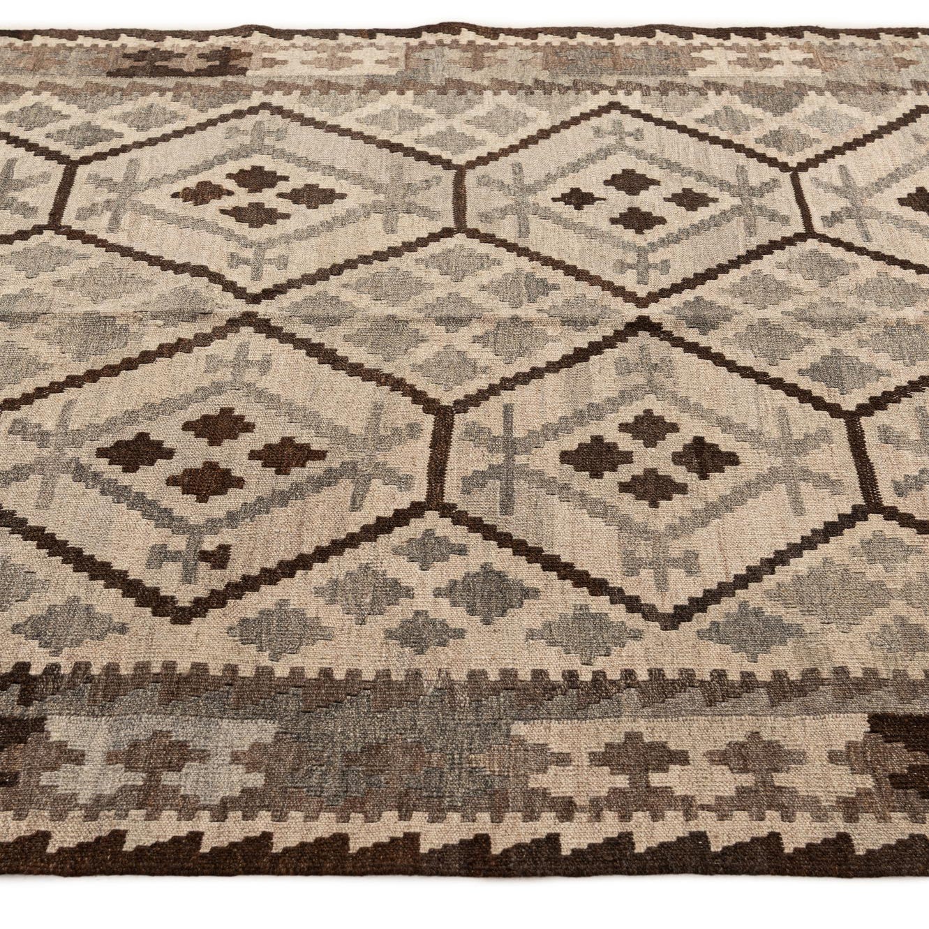 A 5x7 rectangular Kilim Maymana wool rug with a tribal geometric pattern in shades of gray and silver.