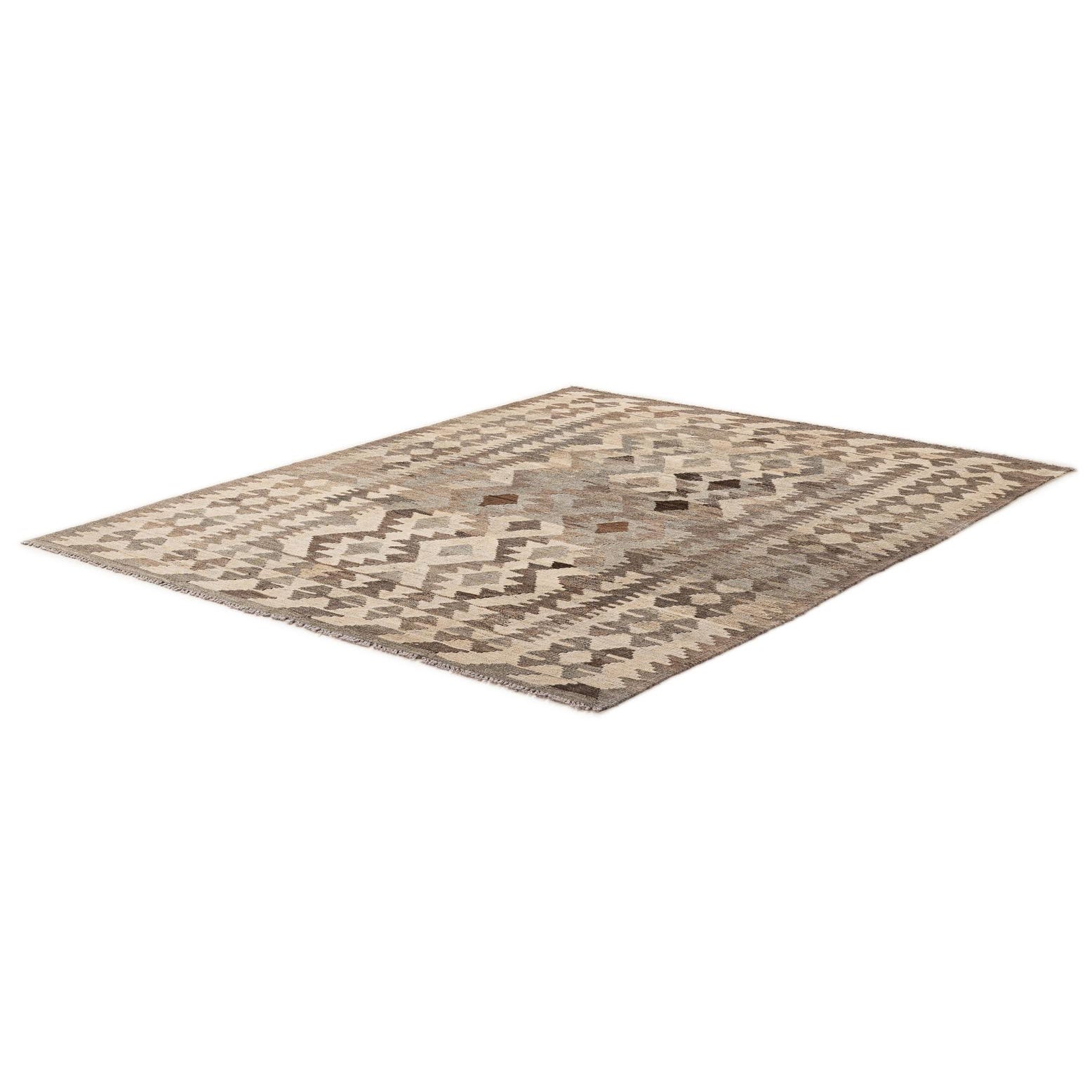 A 5x7 rectangular Kilim Maymana rug featuring a tribal geometric pattern in various shades of gray, silver, and beige.