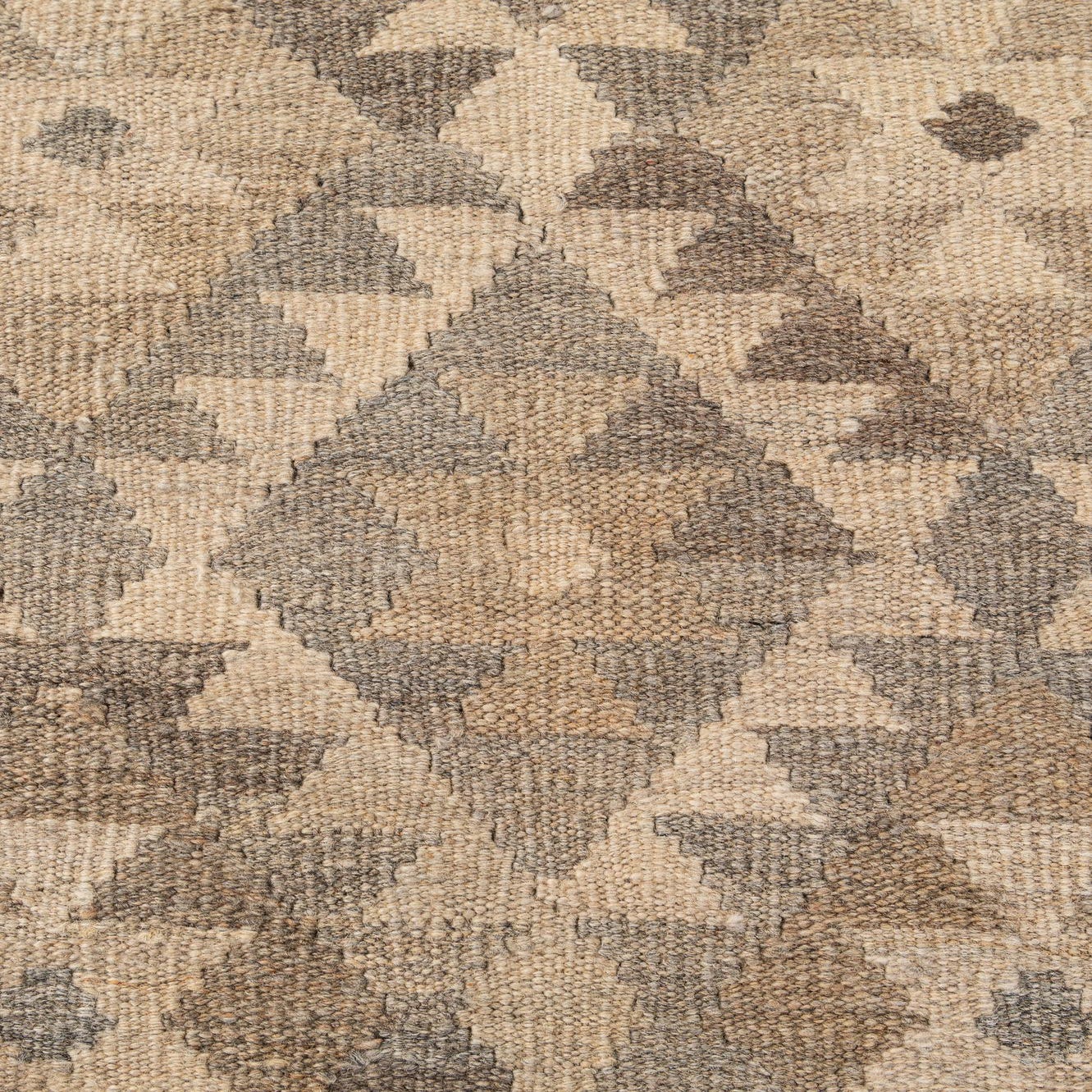A 5x7 rectangular Kilim Maymana wool rug featuring a tribal geometric diamond pattern in varying shades of gray and silver.
