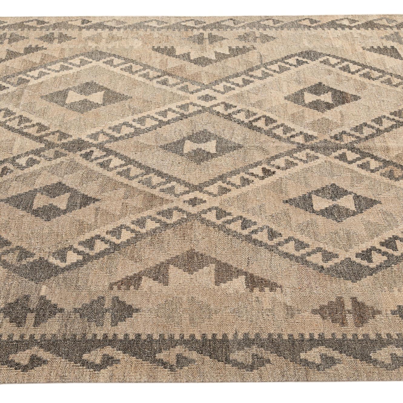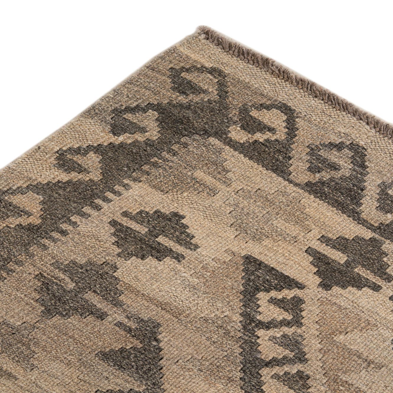 A 5x7 rectangular Kilim Maymana wool rug featuring a tribal geometric pattern in shades of gray and silver.