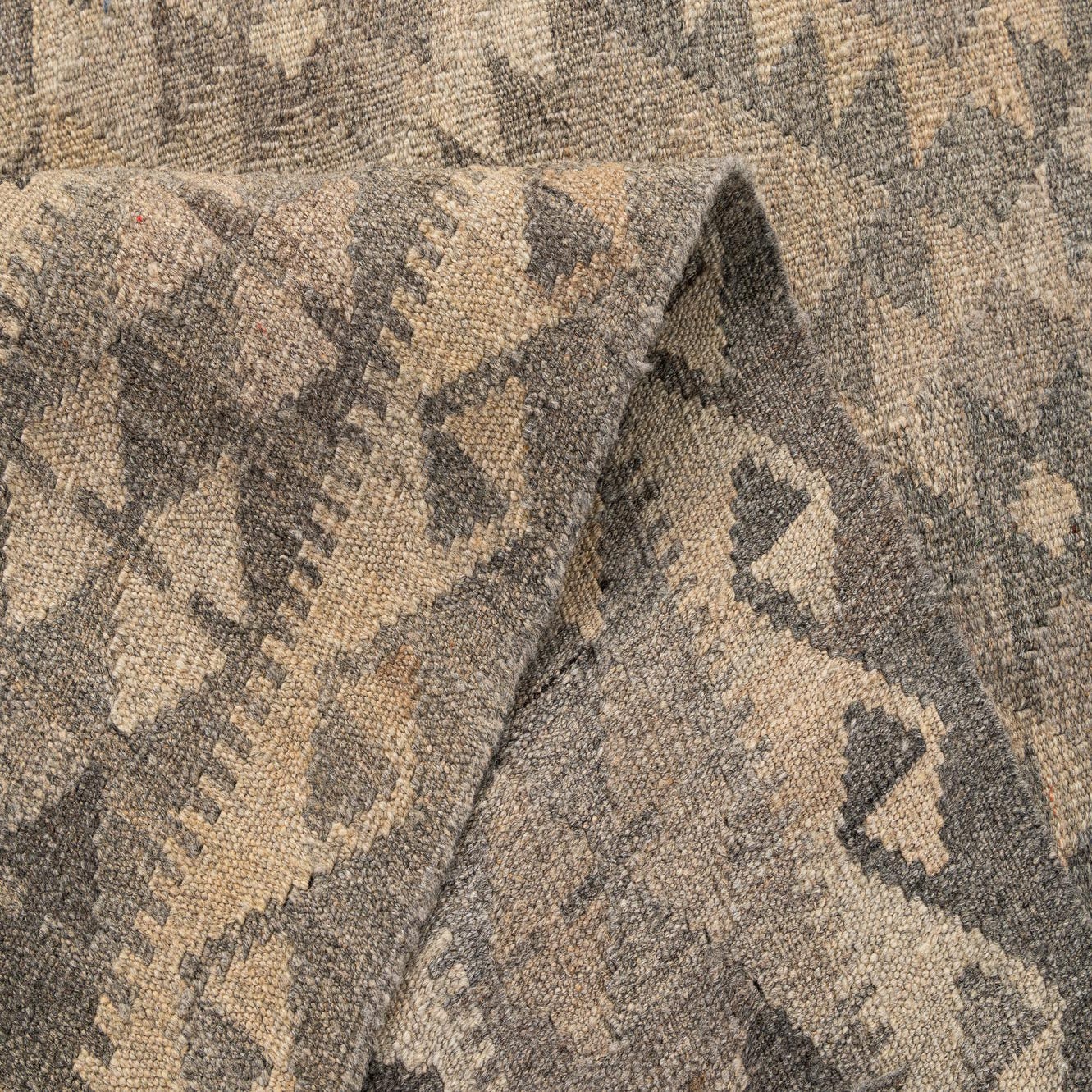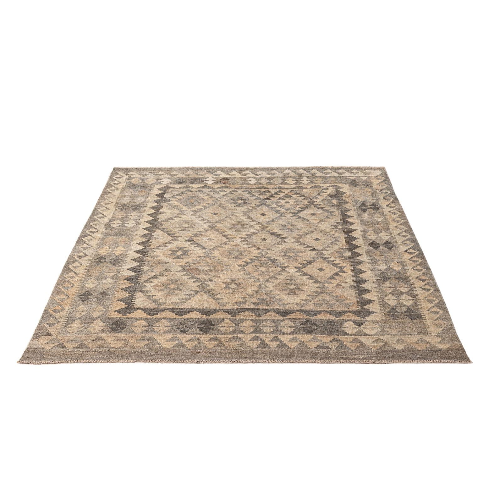 A 5x7 rectangular Kilim Maymana rug featuring a tribal geometric pattern in varying shades of gray and silver.