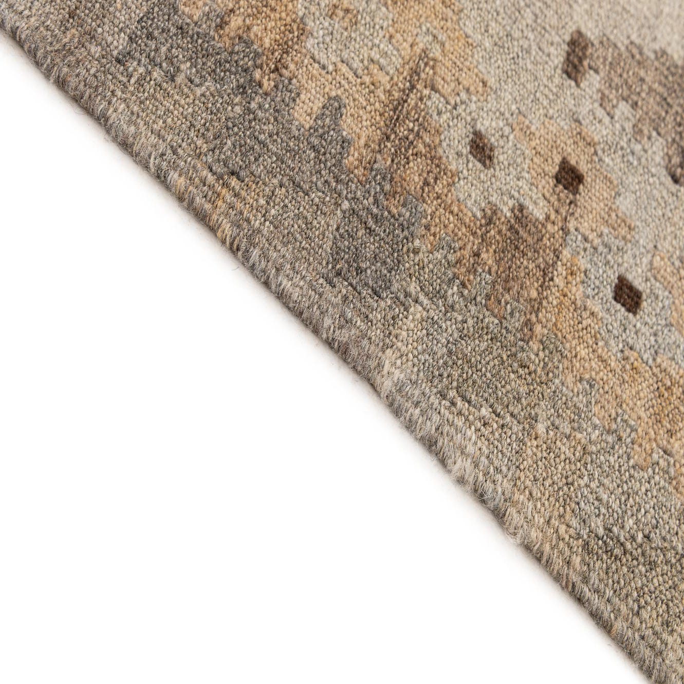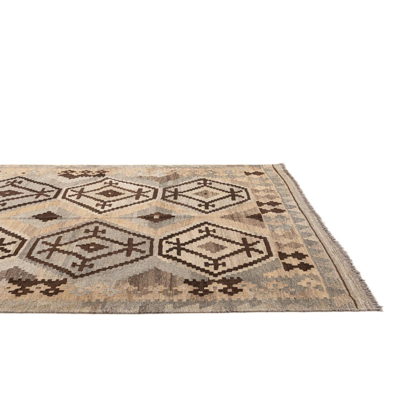 A 5x7 rectangular Kilim Maymana rug featuring a tribal geometric pattern in shades of gray, silver, and brown.