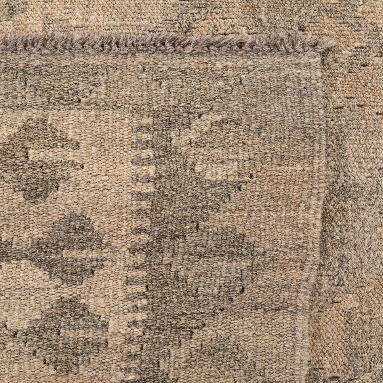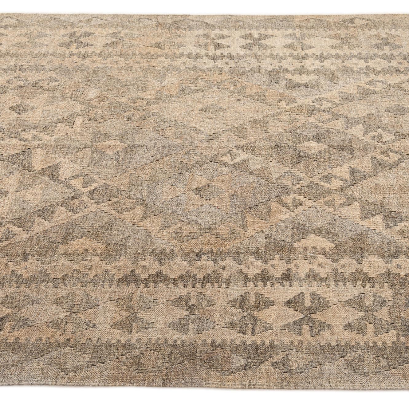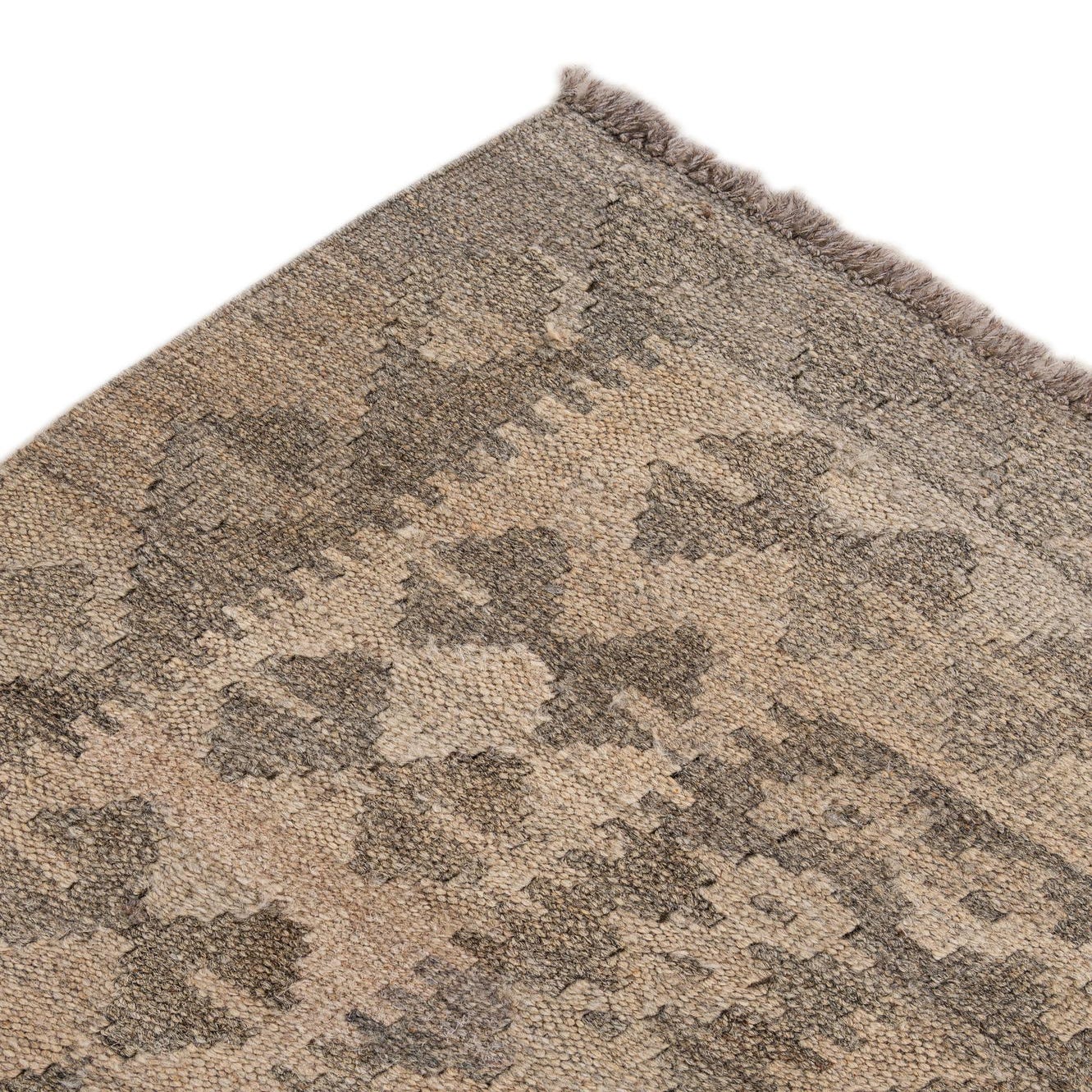 A 5x7 rectangular Kilim Maymana wool rug with a tribal geometric pattern in shades of gray and silver.