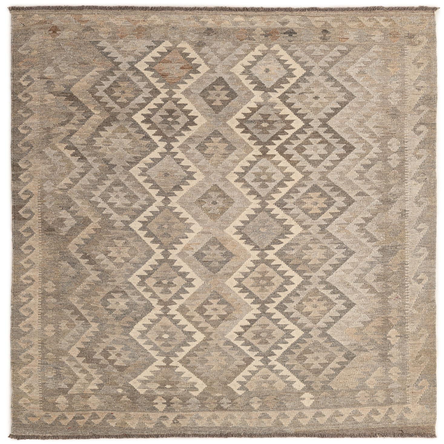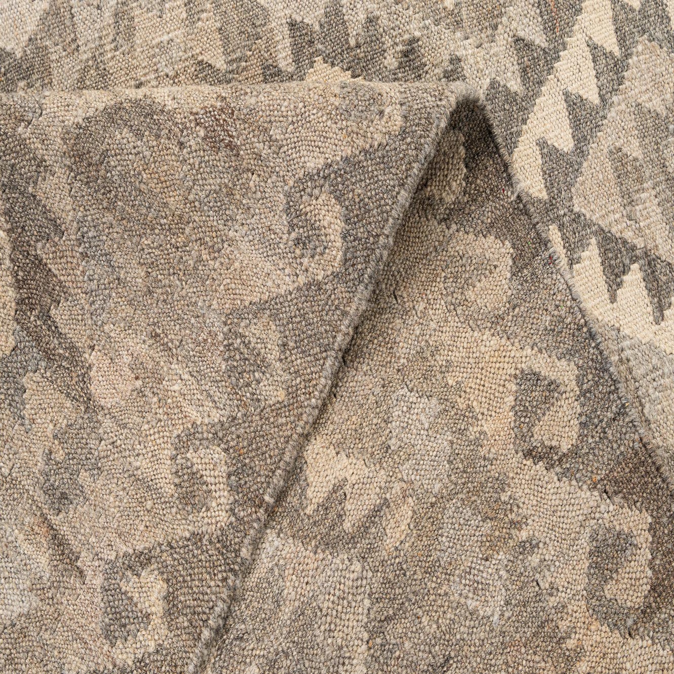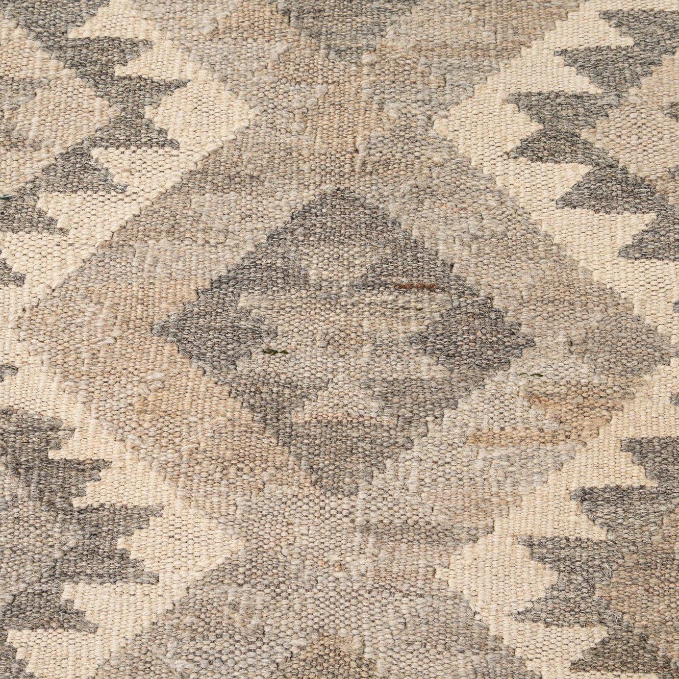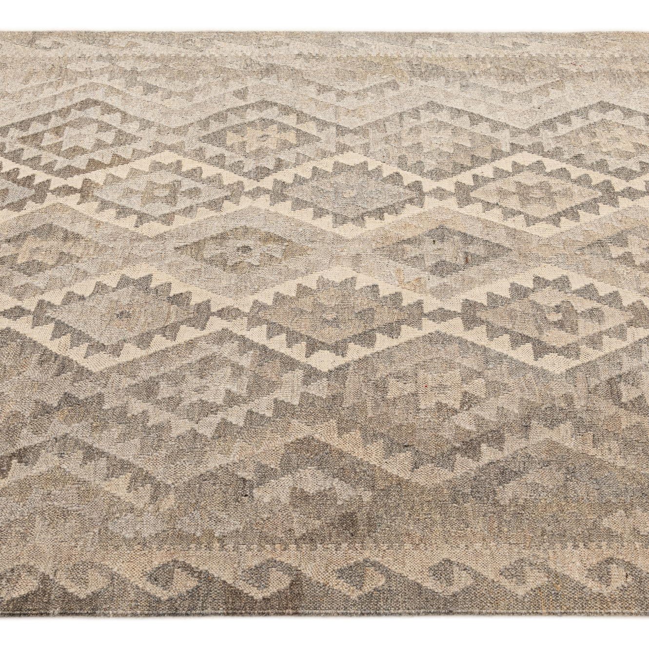 A 5x7 rectangular Kilim Maymana rug featuring a tribal geometric diamond pattern in varying shades of gray and silver, with a flatweave texture.
