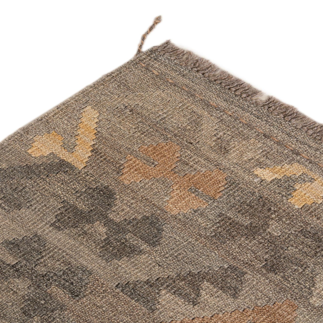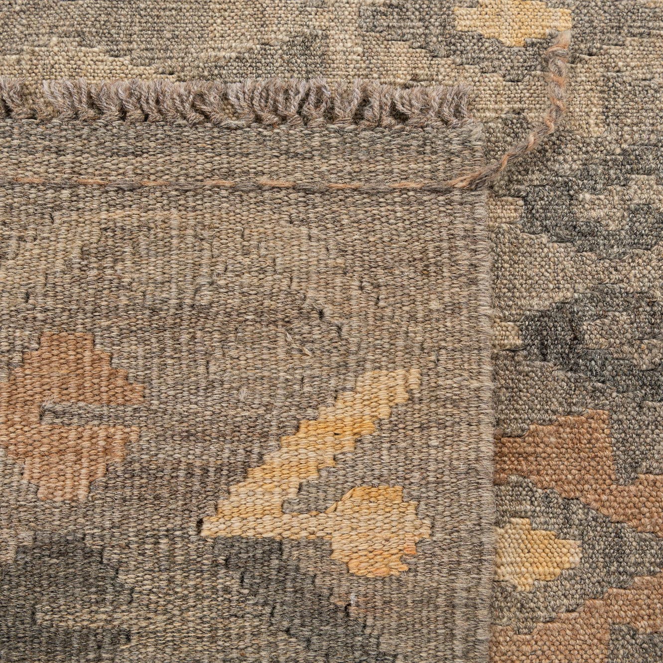 A 5x7 rectangular Kilim Maymana rug featuring a tribal geometric pattern in shades of gray, silver, and muted earth tones.