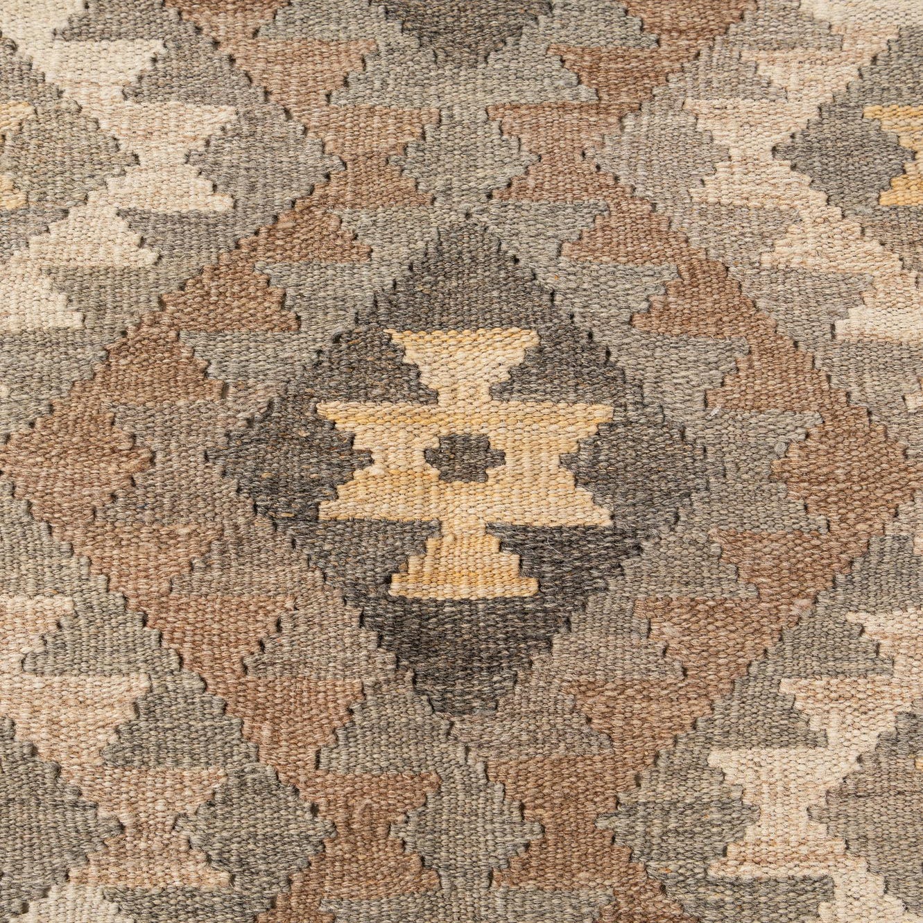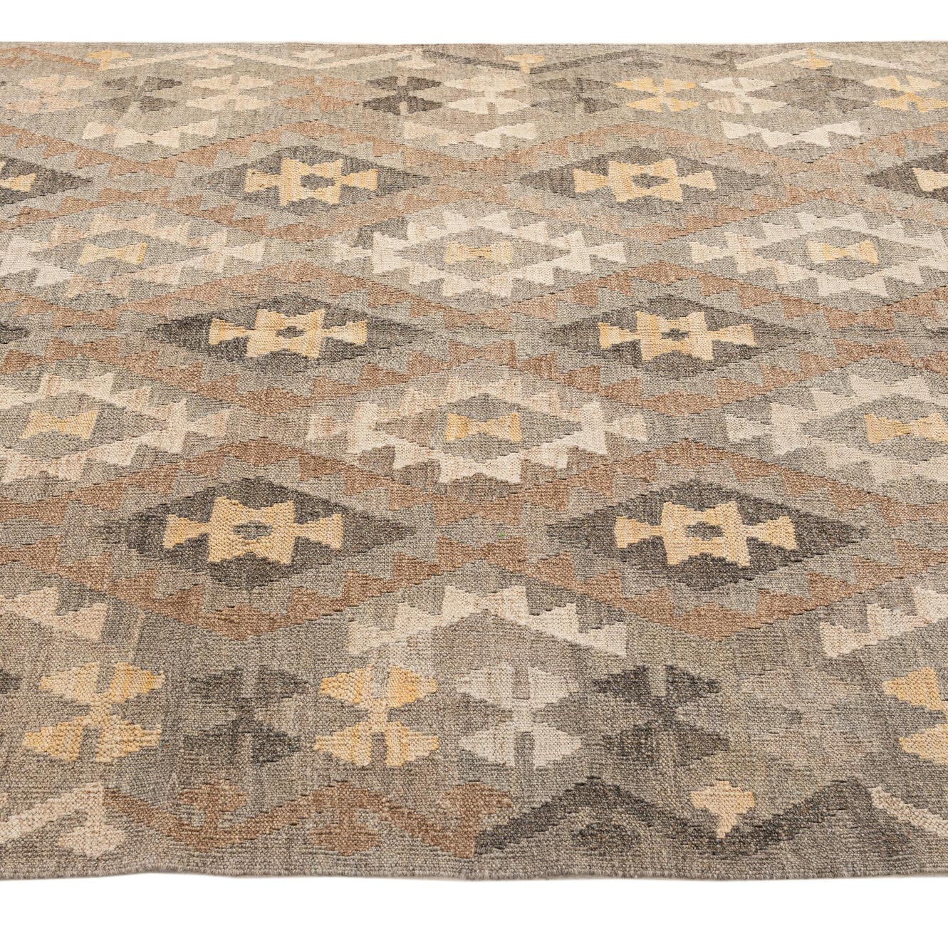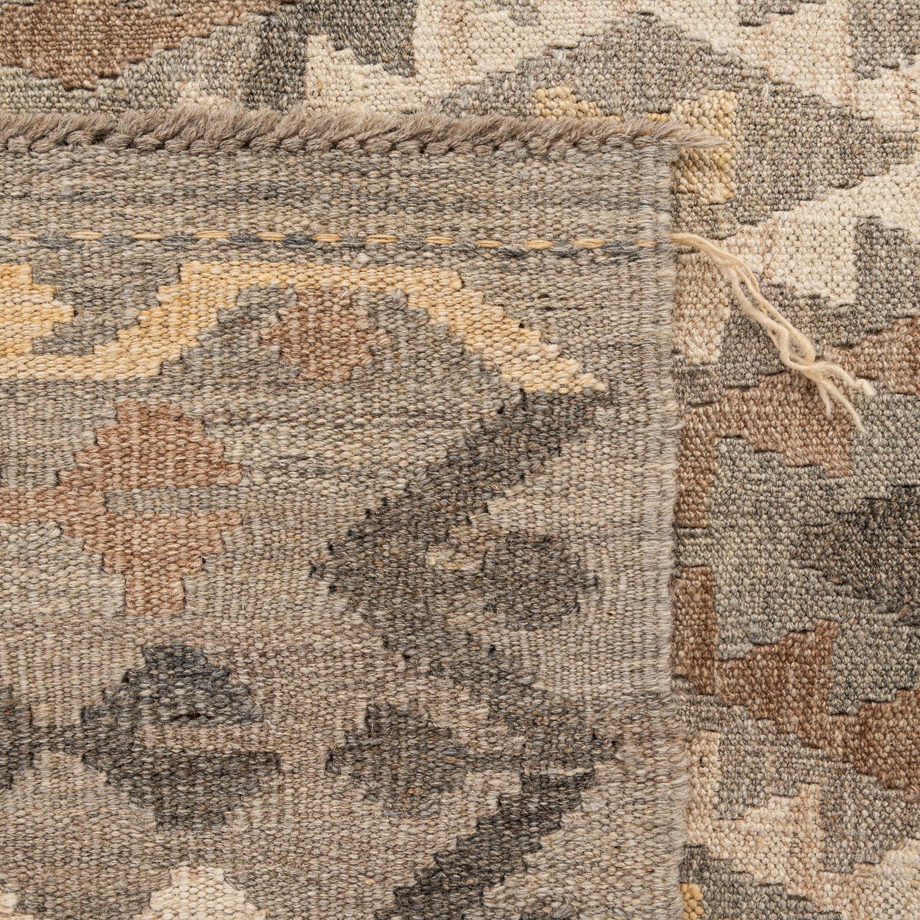 A 5x7 rectangular Kilim Maymana rug featuring a tribal geometric pattern in shades of gray, silver, brown, and cream.