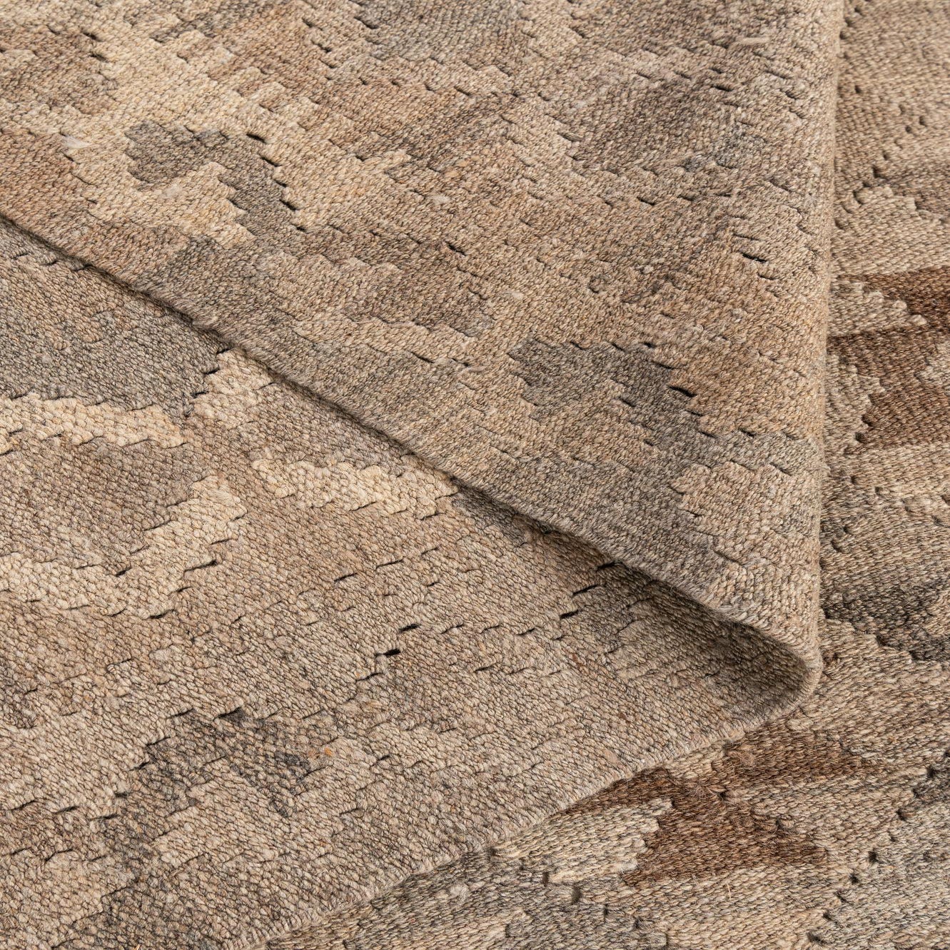 A 5x7 rectangular Kilim Maymana rug featuring a tribal geometric pattern in varying shades of gray, silver, and brown, with a flatweave texture.