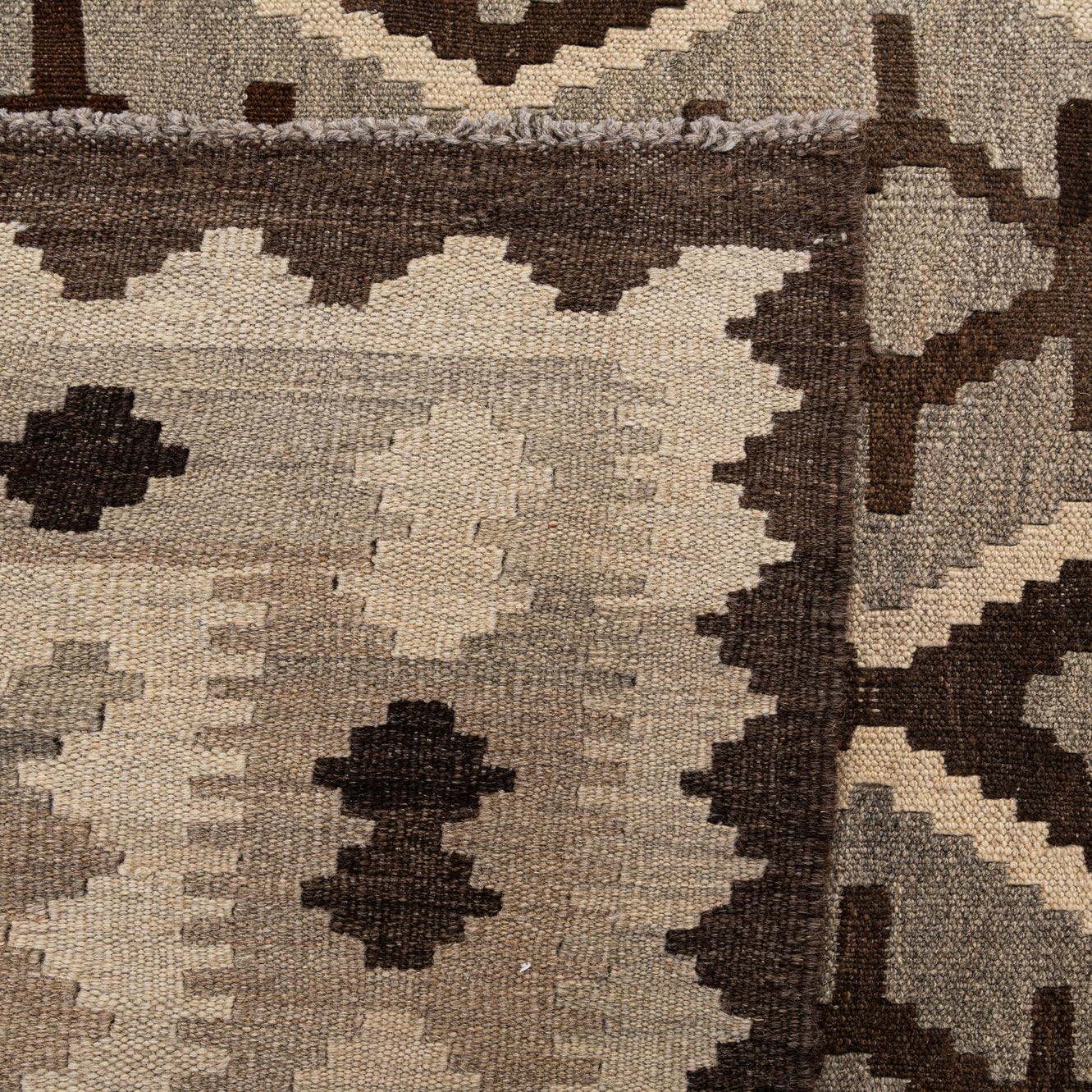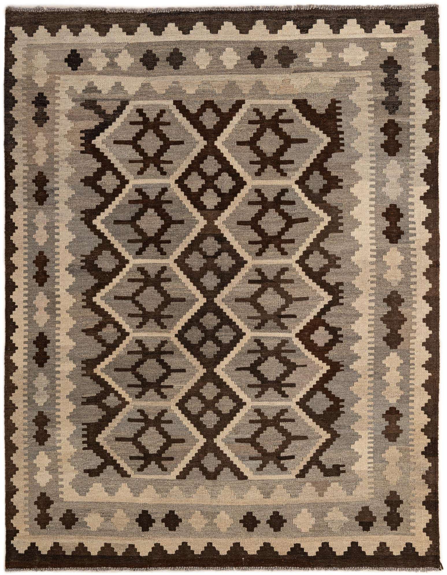 A 5x7 rectangular Kilim Maymana wool rug featuring tribal geometric patterns in shades of gray, silver, and dark brown.