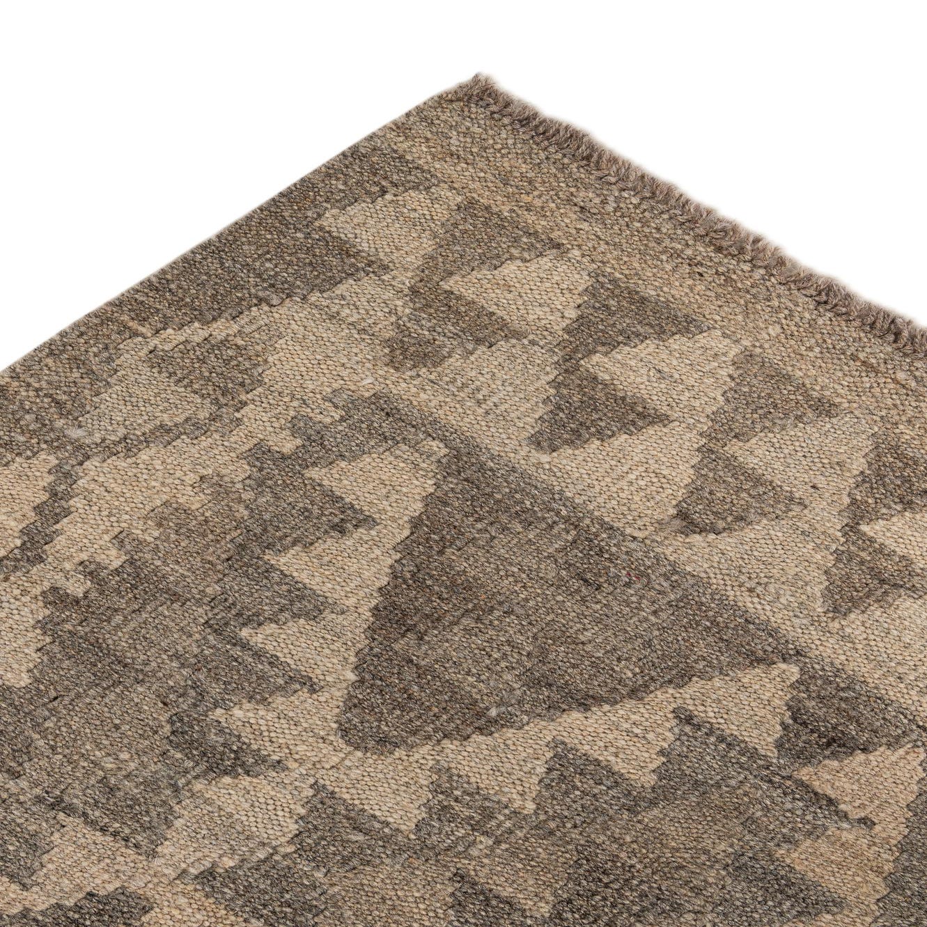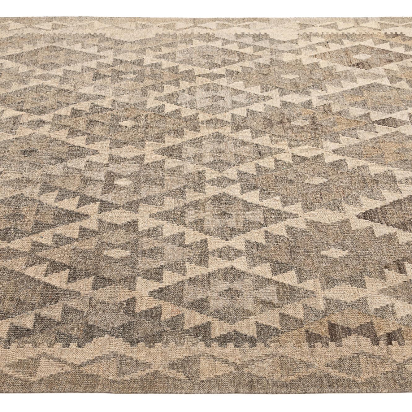 A structured geometric kilim motif fills the field with repeating diamond medallions and stepped-triangle accents, framed by a subtle sawtooth border. The gray background anchors the design while beige and ivory motifs provide soft contrast and a layered, slightly weathered look. Hand-woven in 100% wool, the rug has a low-profile weave with a tactile surface—visible woven texture and slight variations in tone lend it depth and a grounded, handcrafted character.