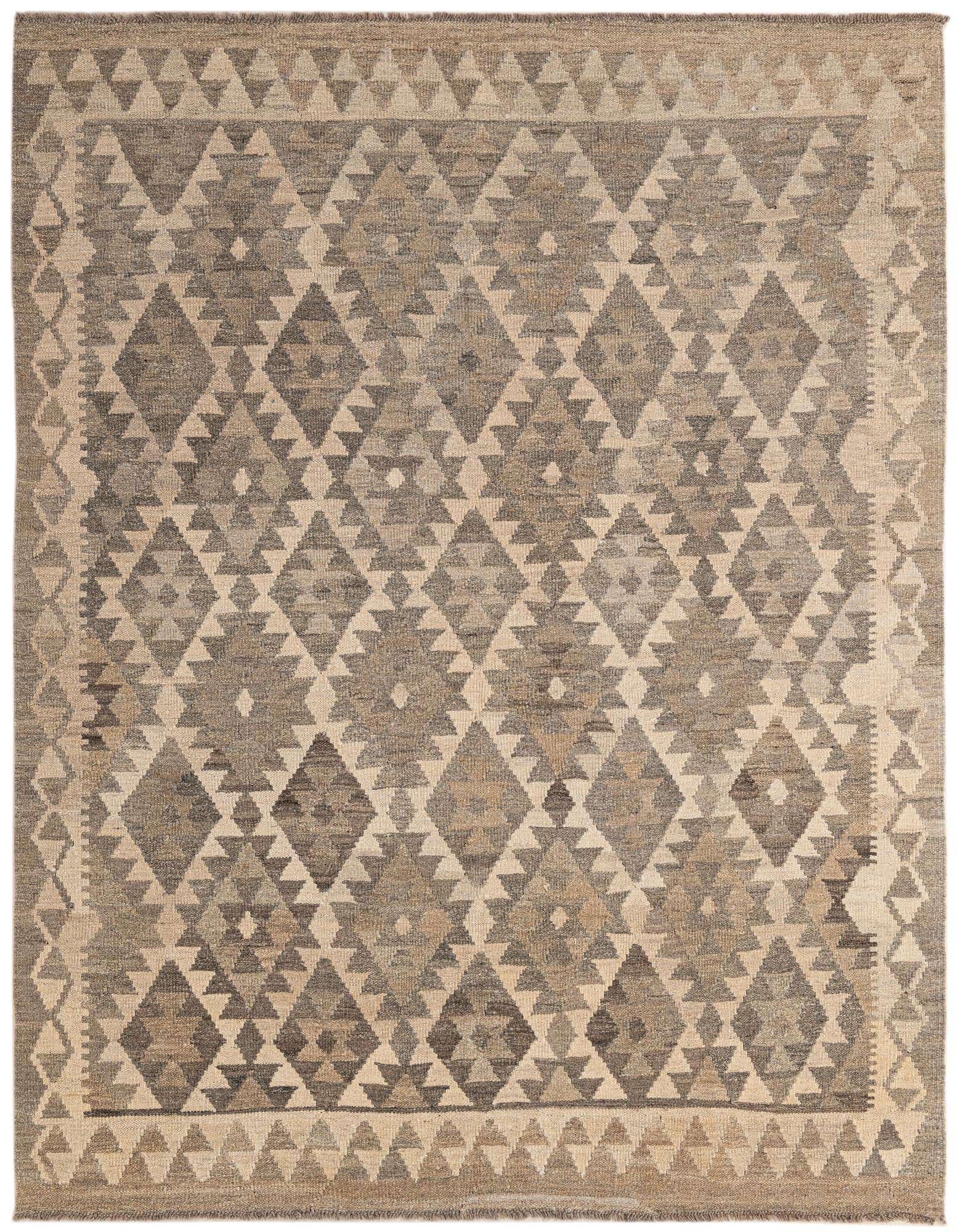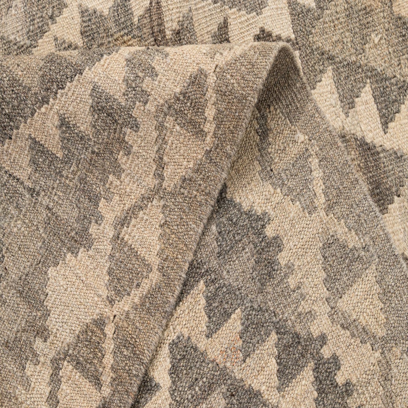 A 5x7 rectangular Kilim Maymana rug featuring a tribal geometric diamond pattern in varying shades of gray and silver.