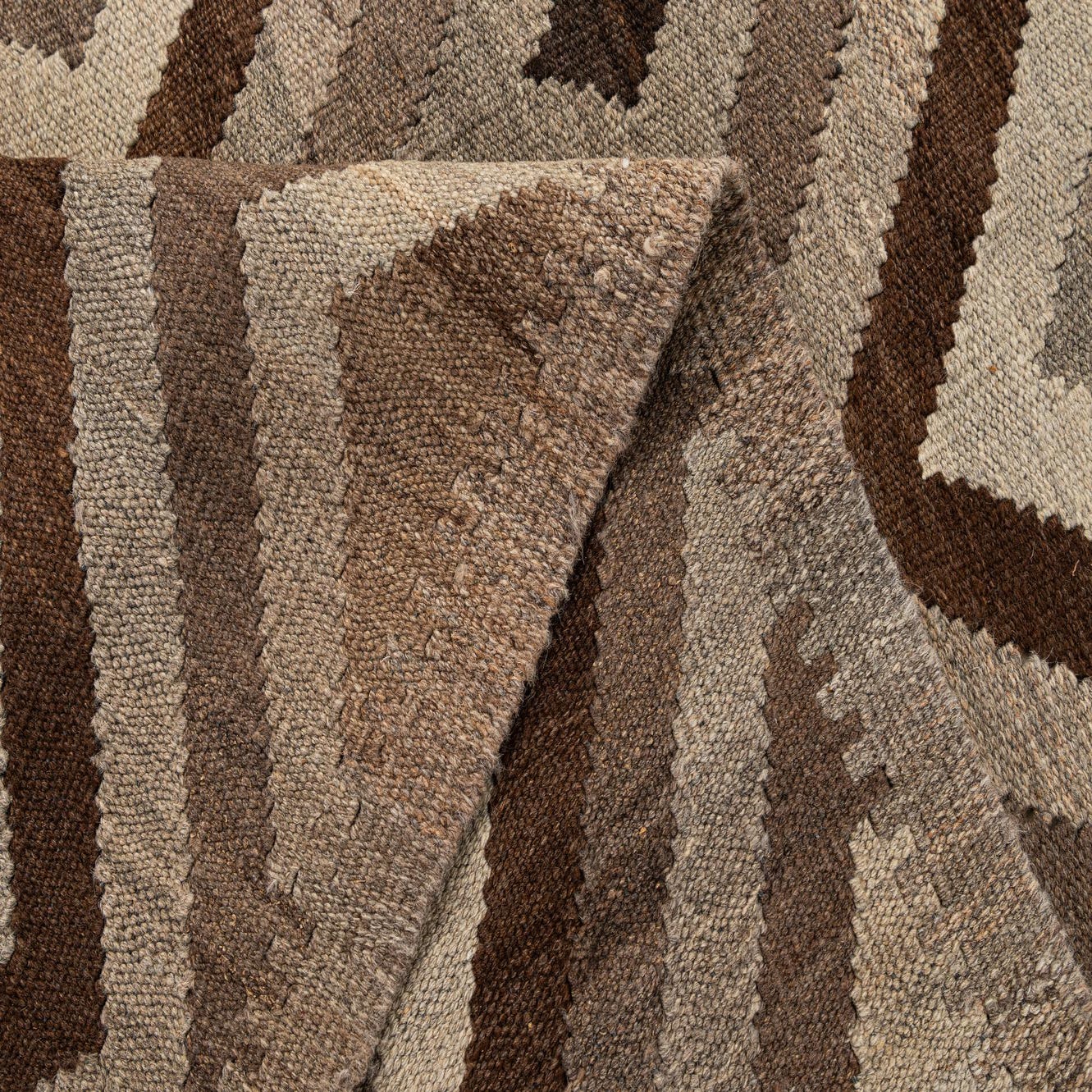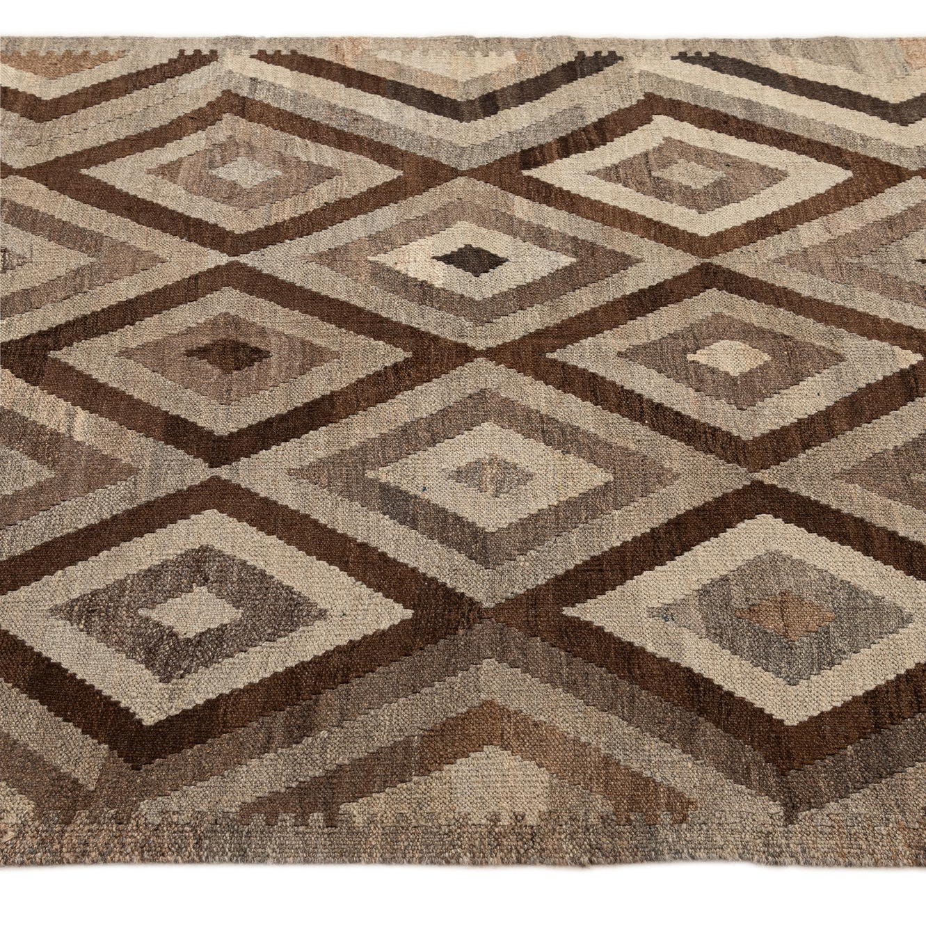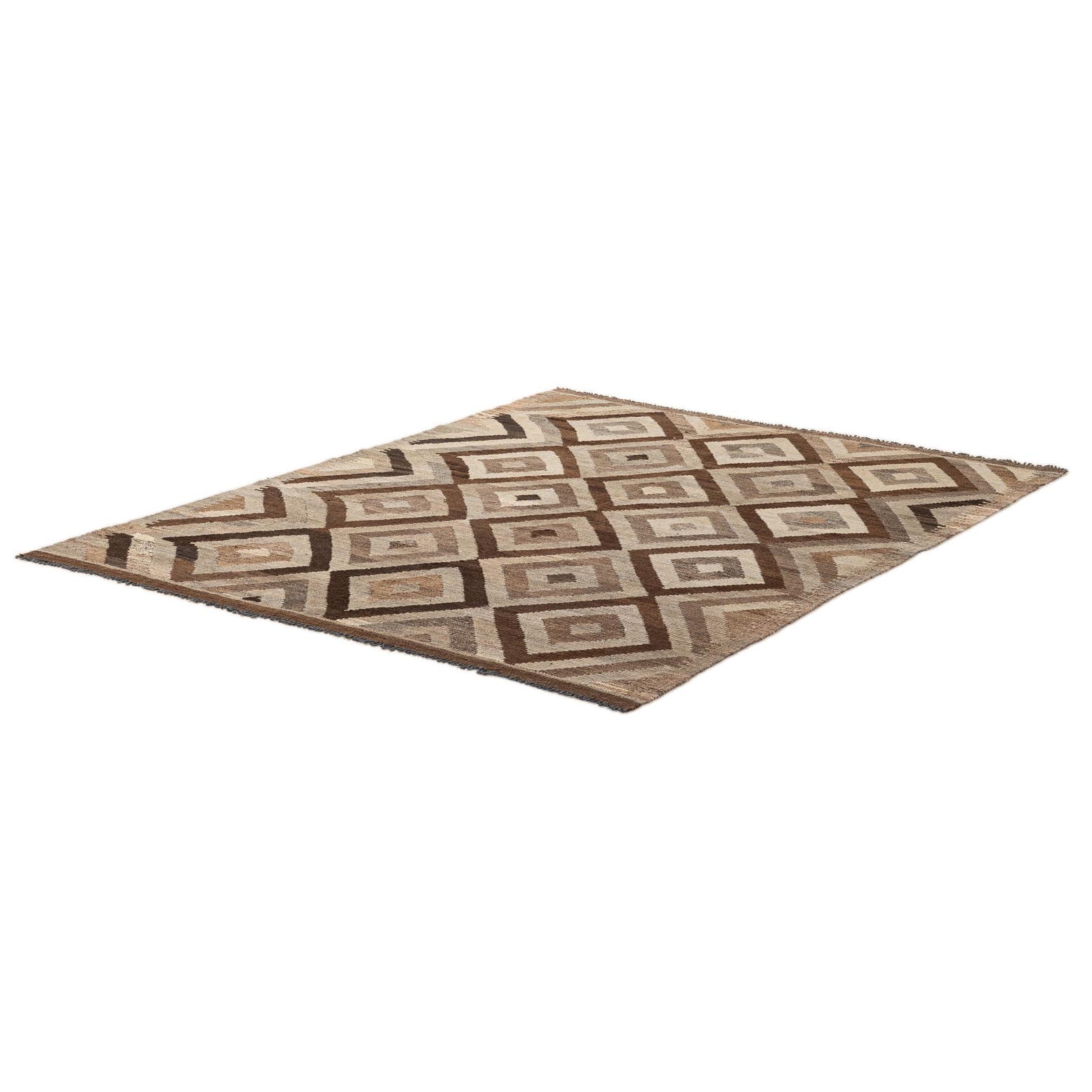 A 5x7 rectangular Kilim Maymana rug featuring a tribal geometric pattern of nested diamonds in varying shades of gray, silver, and brown.