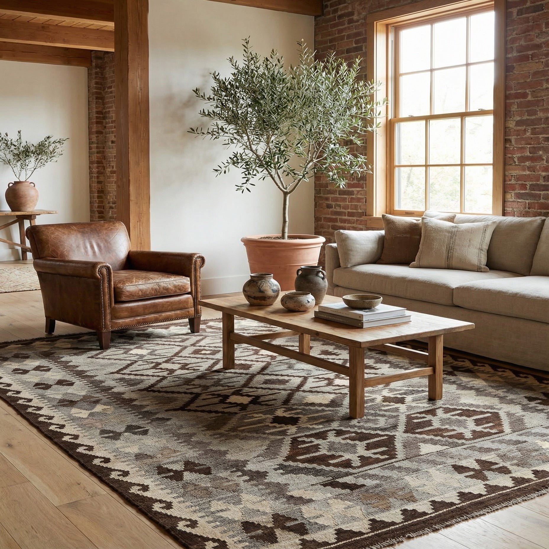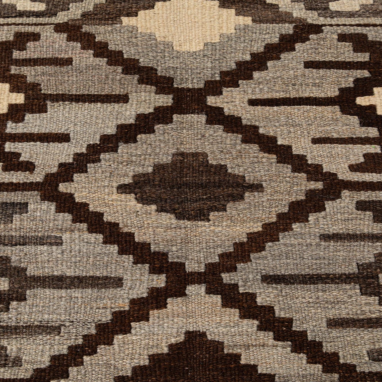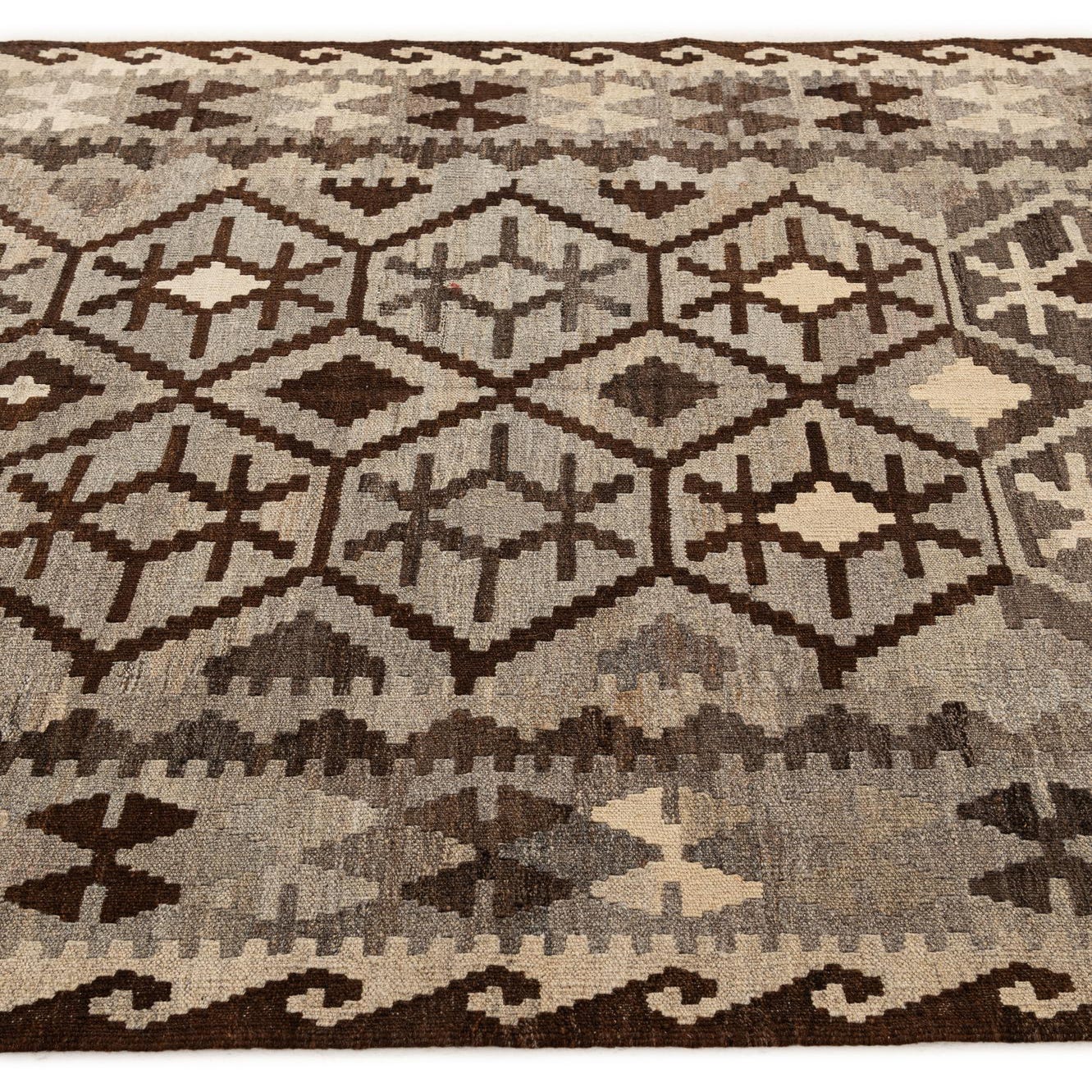 A 5x7 rectangular Kilim Maymana wool rug in shades of gray, silver, and dark brown, featuring a tribal geometric pattern.