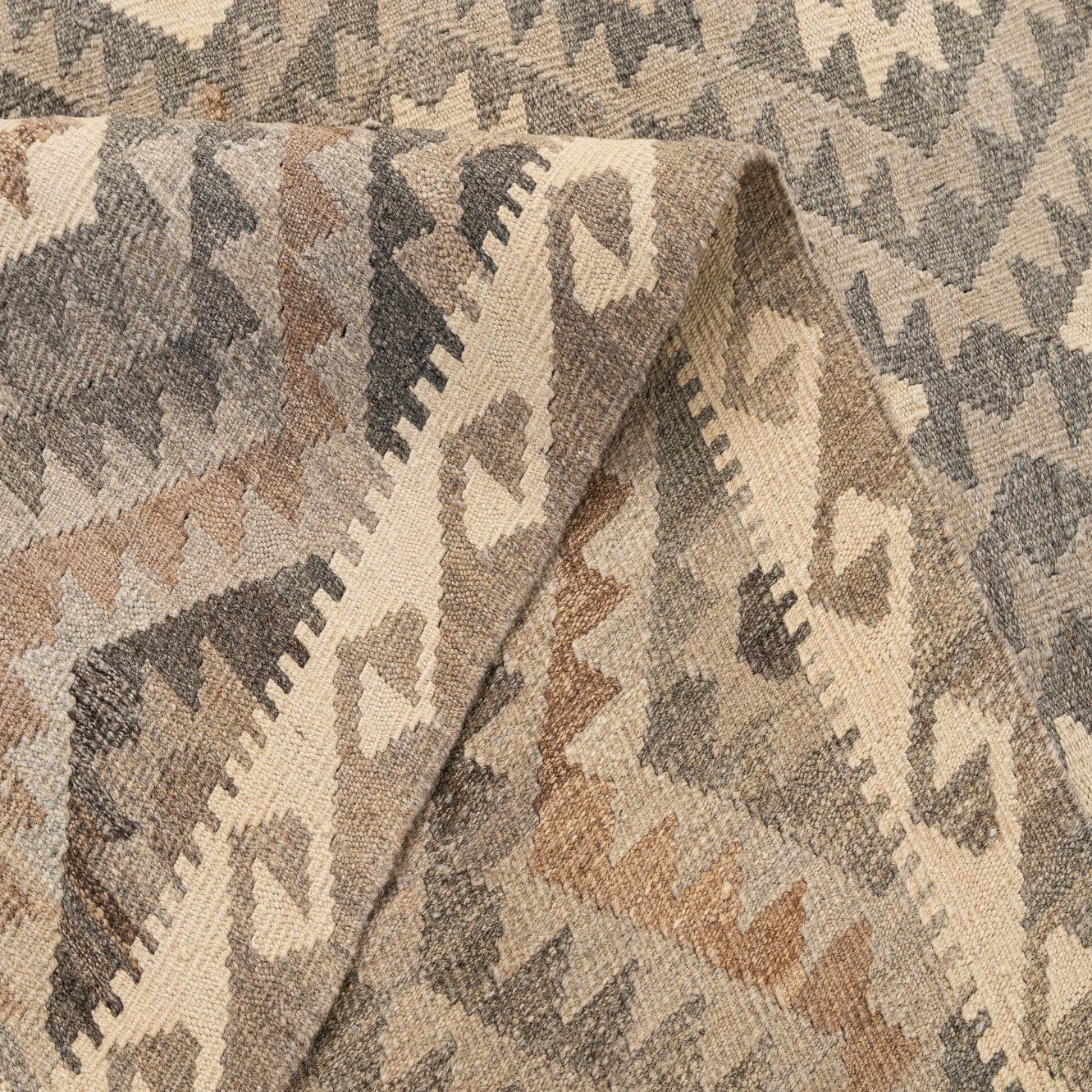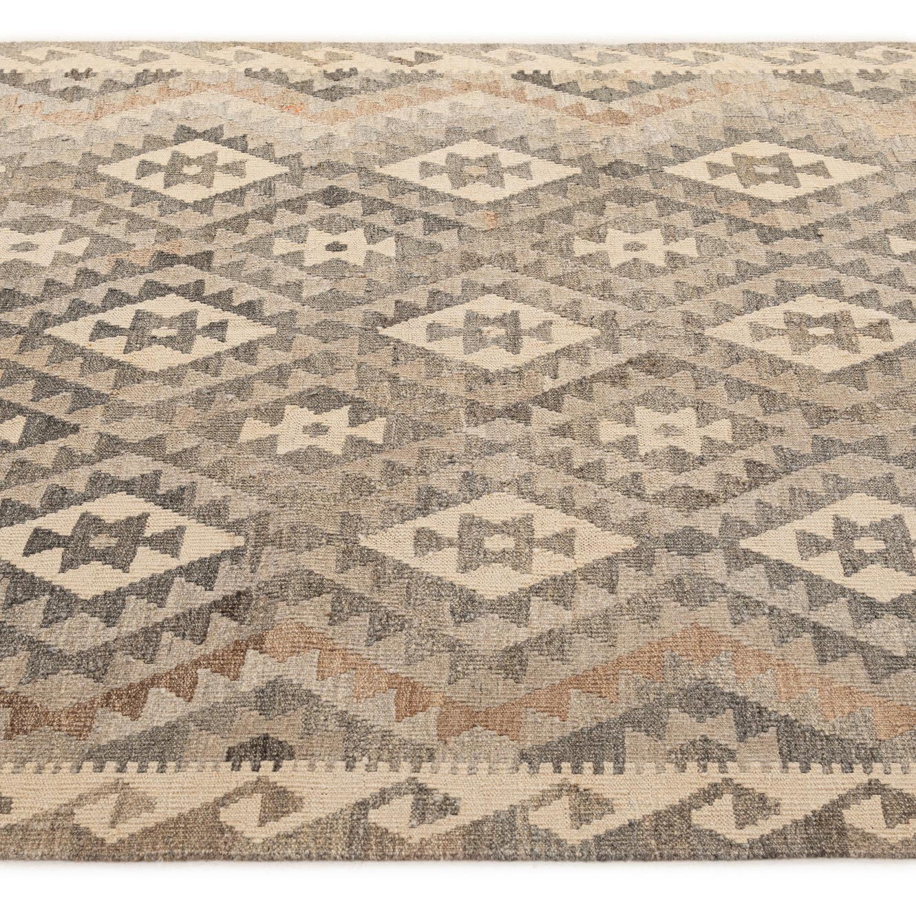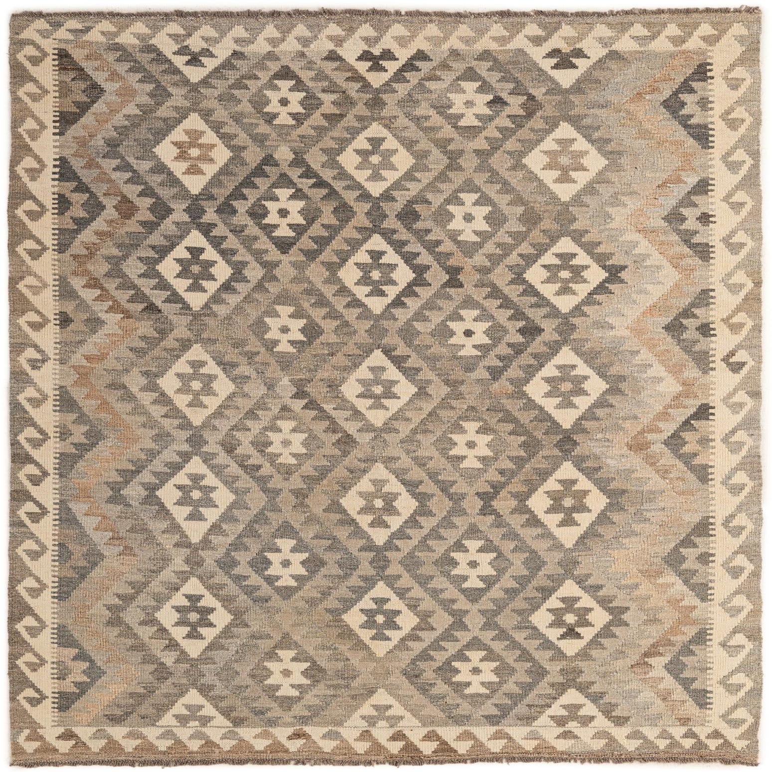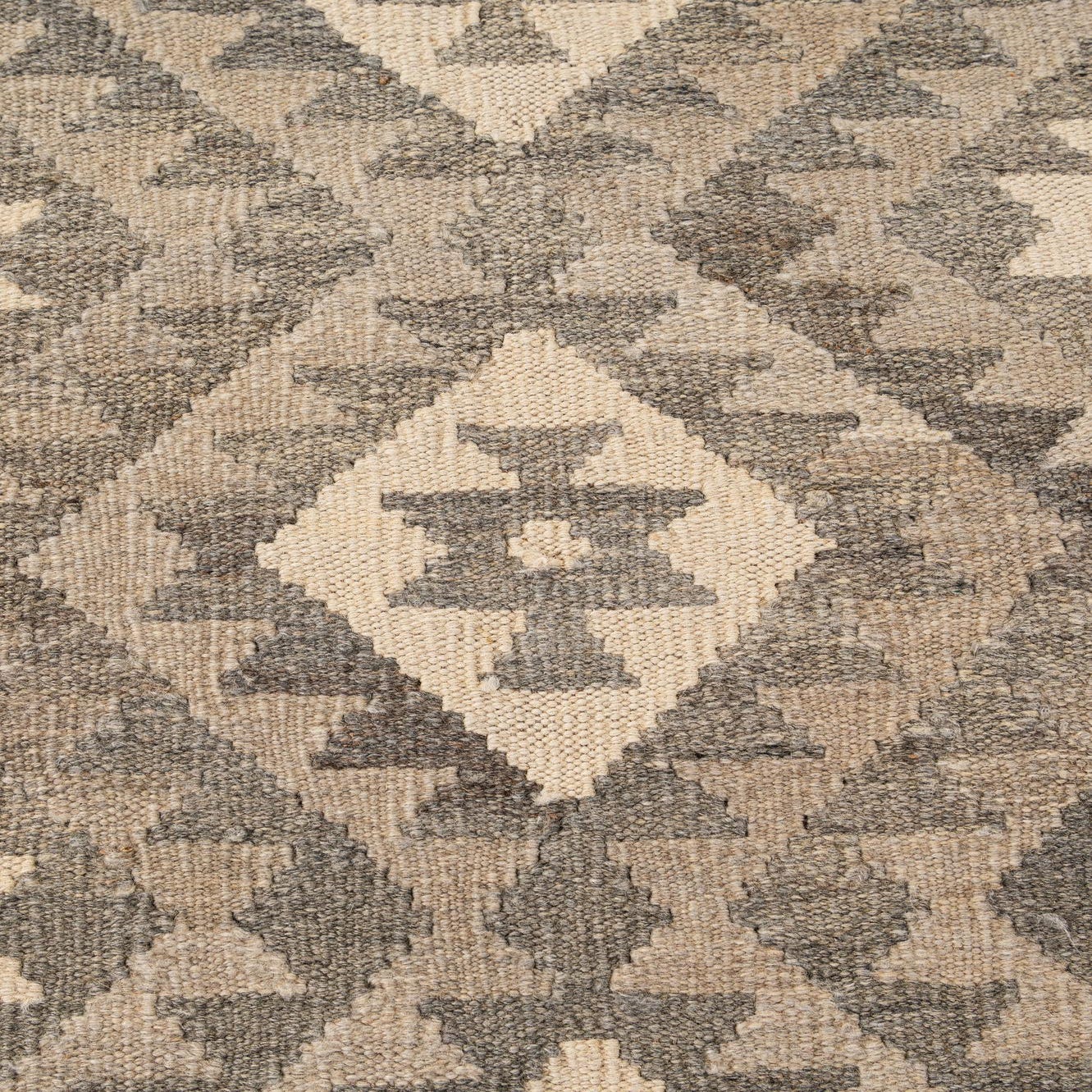 A 5x7 rectangular Kilim Maymana rug featuring a tribal diamond pattern in various shades of gray, silver, and cream.