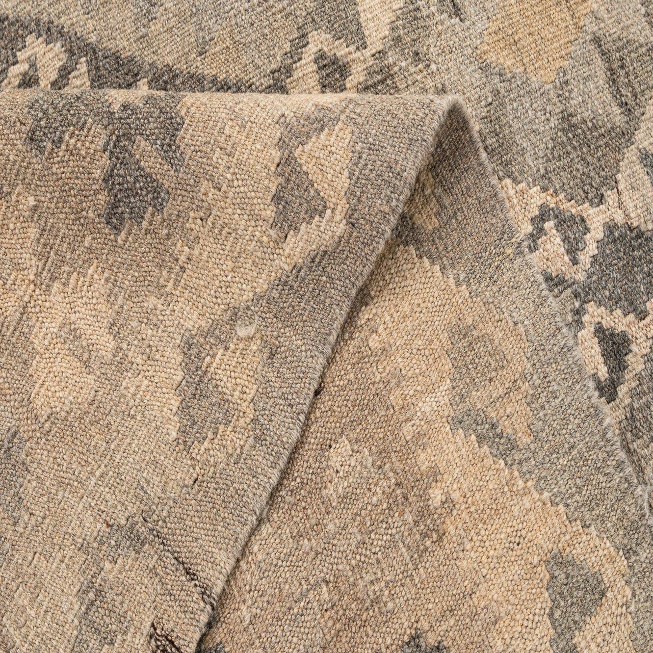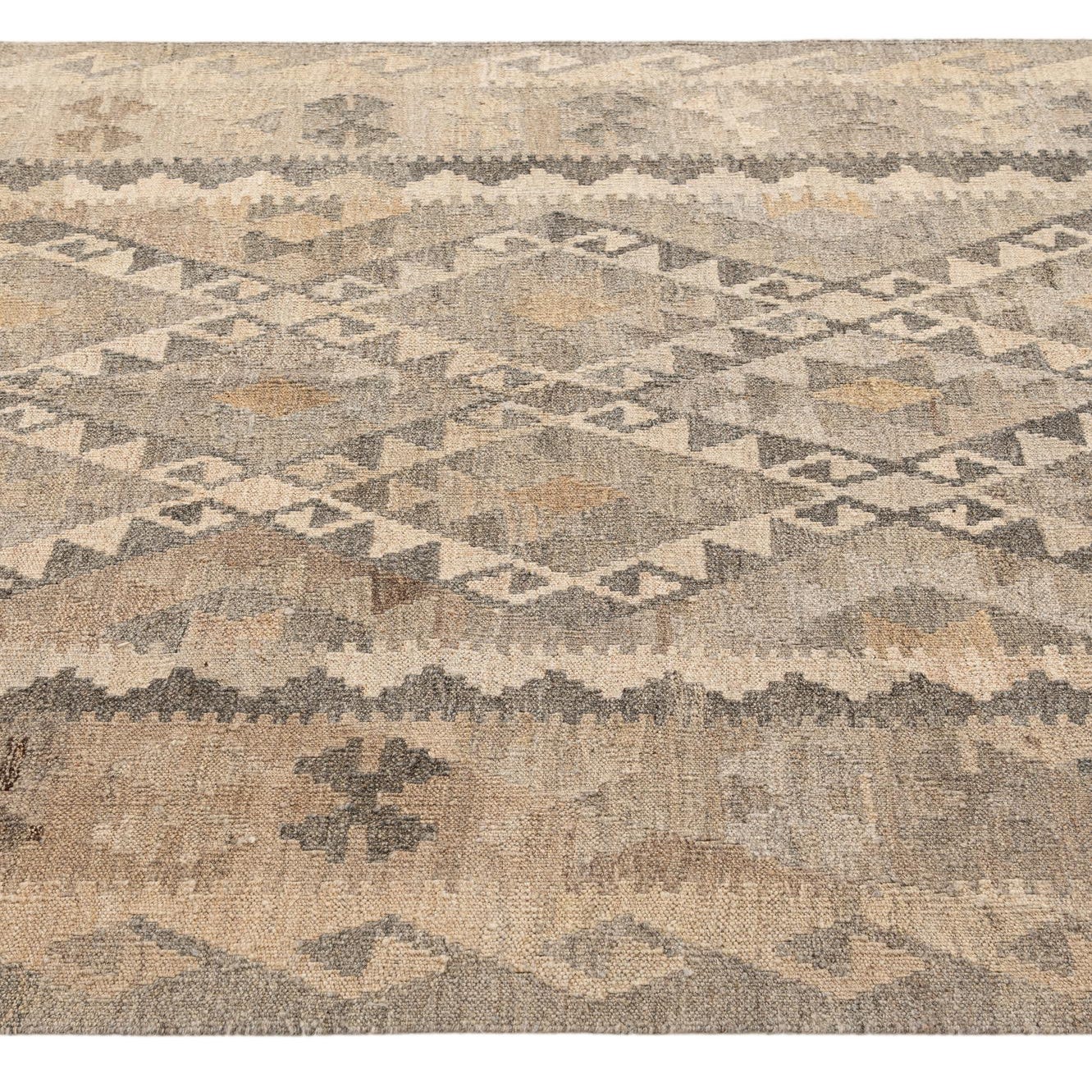 A 5x7 rectangular Kilim Maymana rug featuring a tribal geometric pattern in various shades of gray and silver.