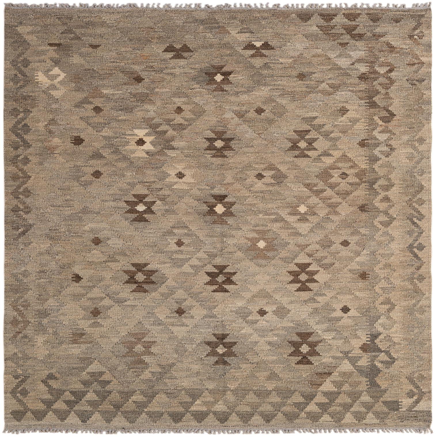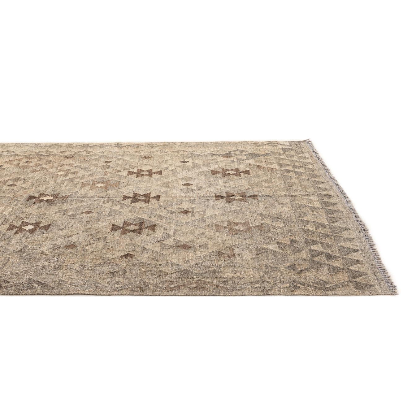 A 5x7 rectangular gray wool flatweave rug with a tribal geometric pattern in varying shades of gray, brown, and cream.