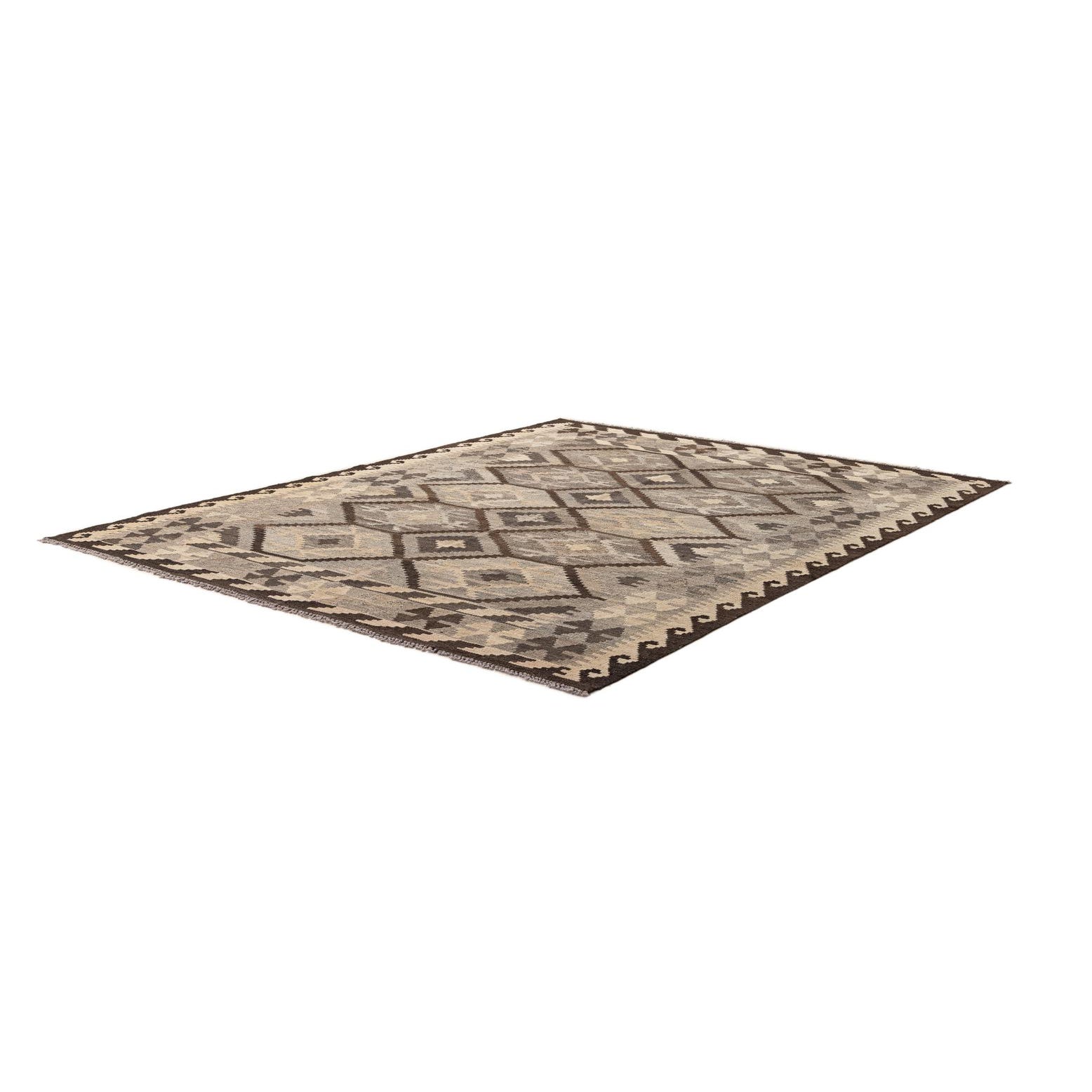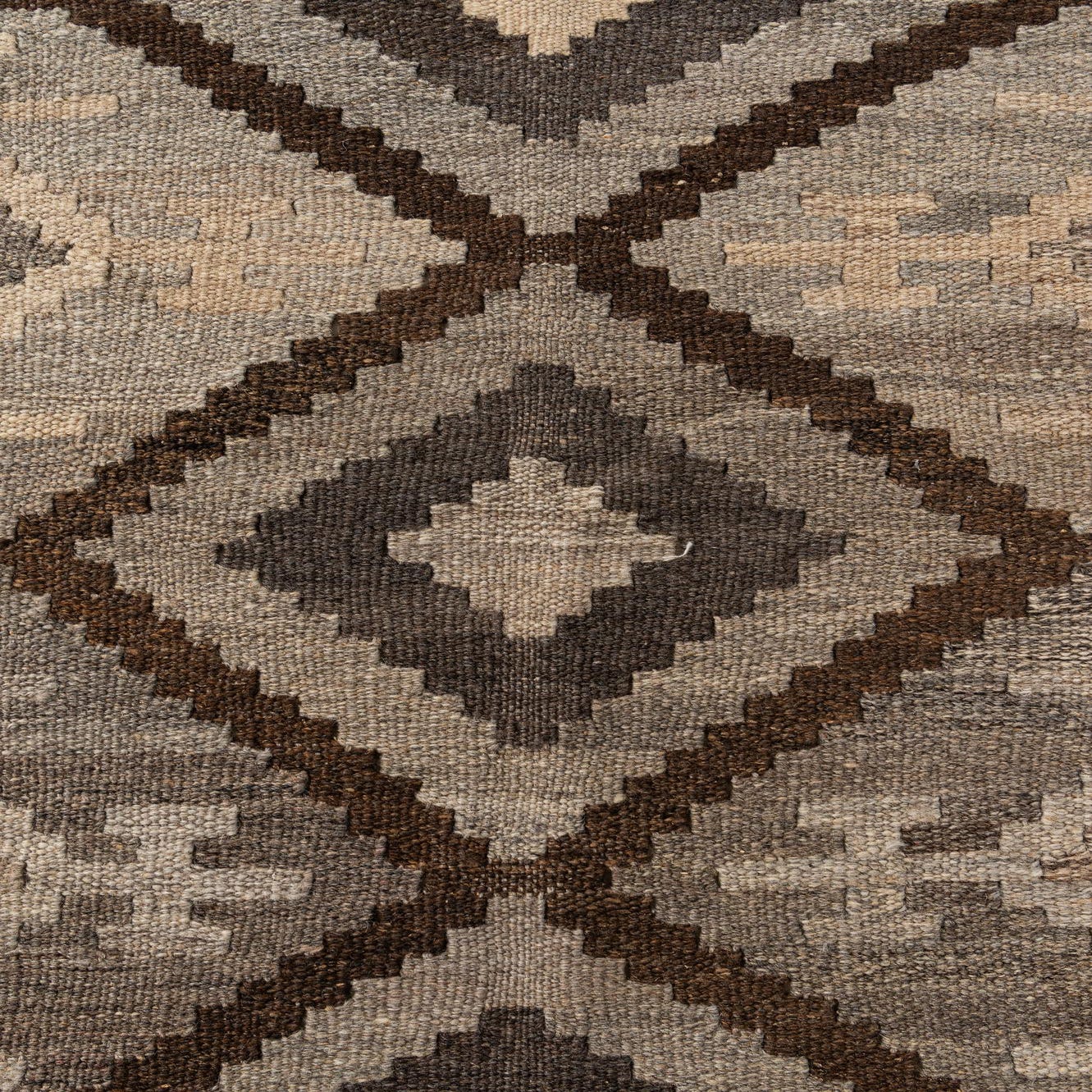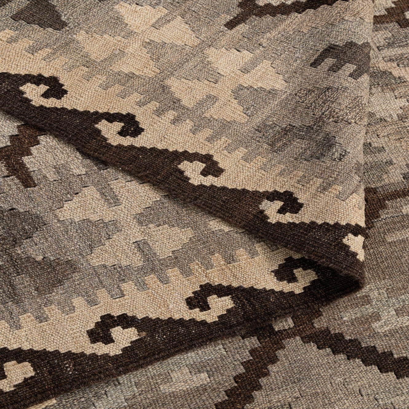 A 5x7 rectangular Kilim Maymana wool rug featuring tribal geometric patterns in shades of gray, silver, and dark brown.
