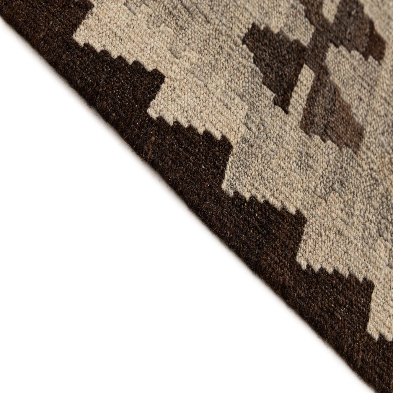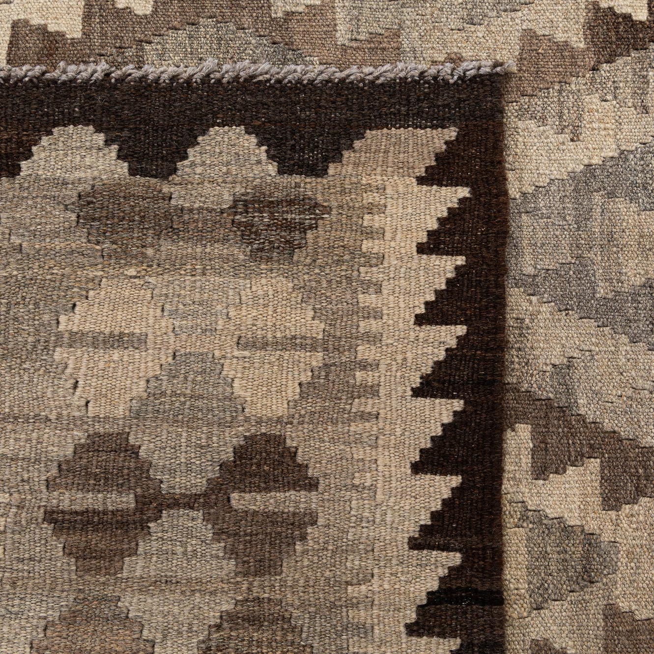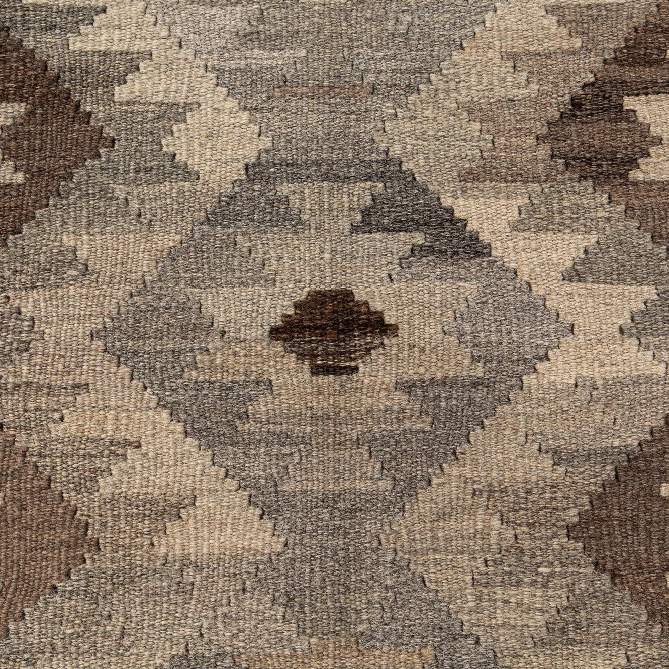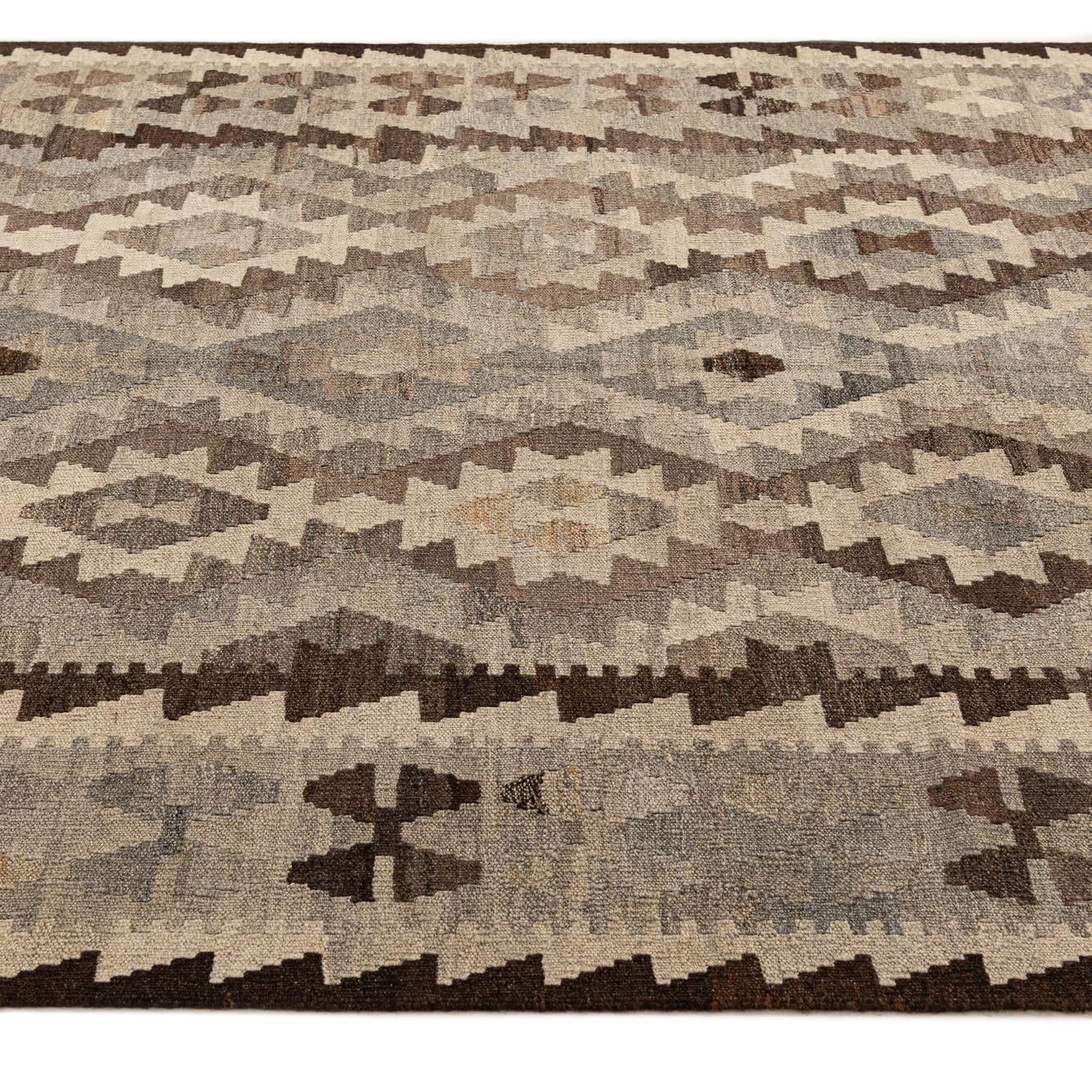 A 5x7 rectangular Kilim Maymana rug featuring a tribal geometric pattern in shades of gray, silver, and brown, perfect for an indoor living space.