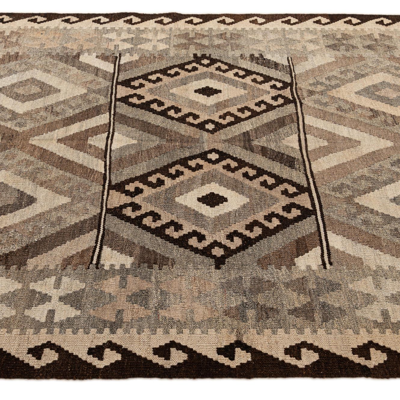 A 5x7 rectangular Kilim Maymana rug featuring a tribal geometric pattern in varying shades of gray, silver, and dark brown, with a flatweave texture.
