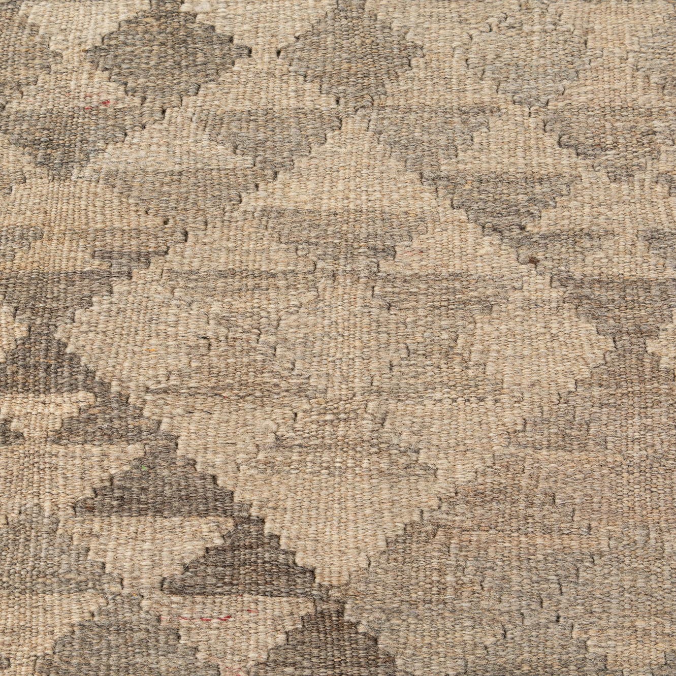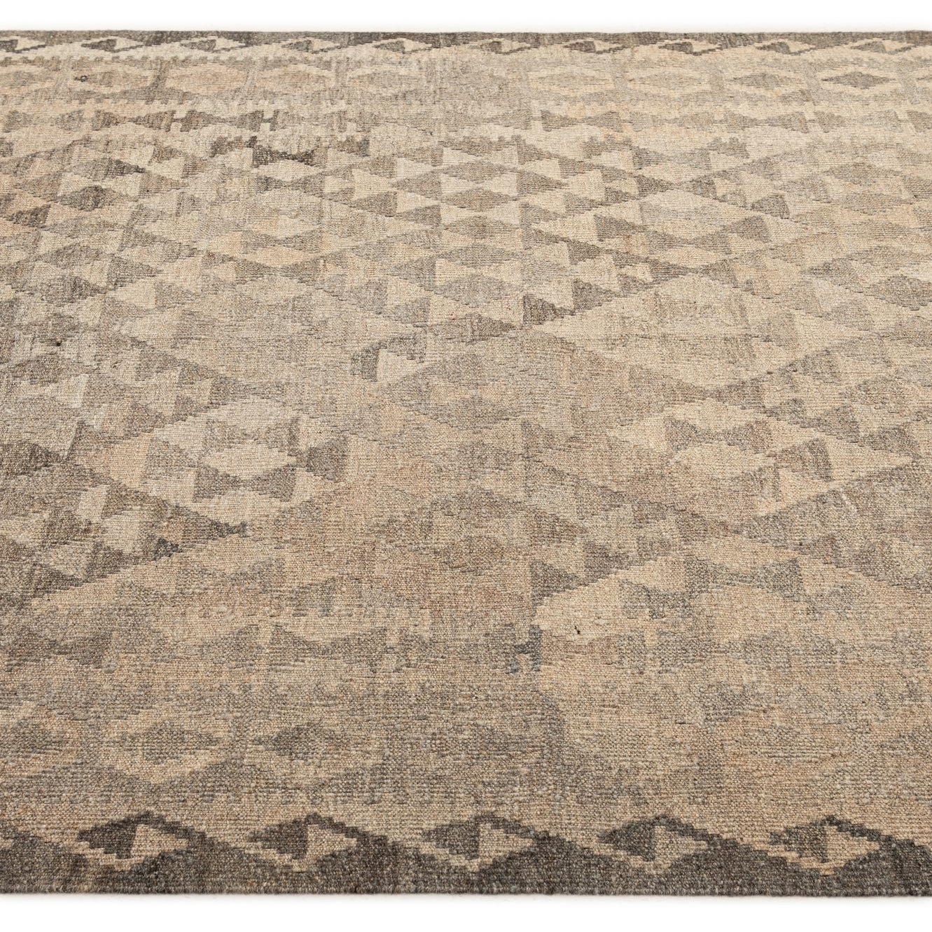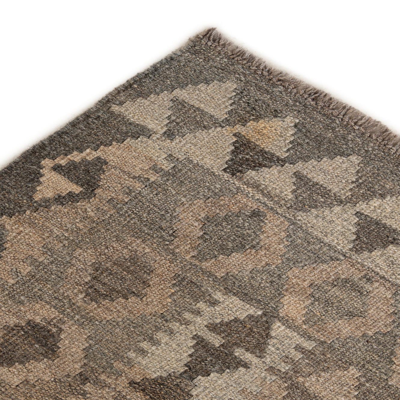 A 5x7 rectangular Kilim Maymana rug featuring a tribal geometric pattern in varying shades of gray and beige, with a darker border.