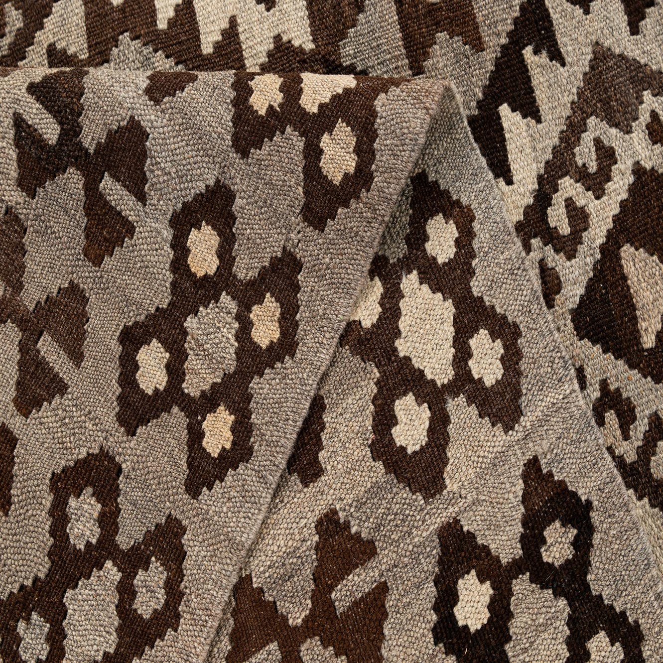 A 5x7 rectangular Kilim Maymana wool rug featuring a tribal geometric pattern in varying shades of gray and silver.