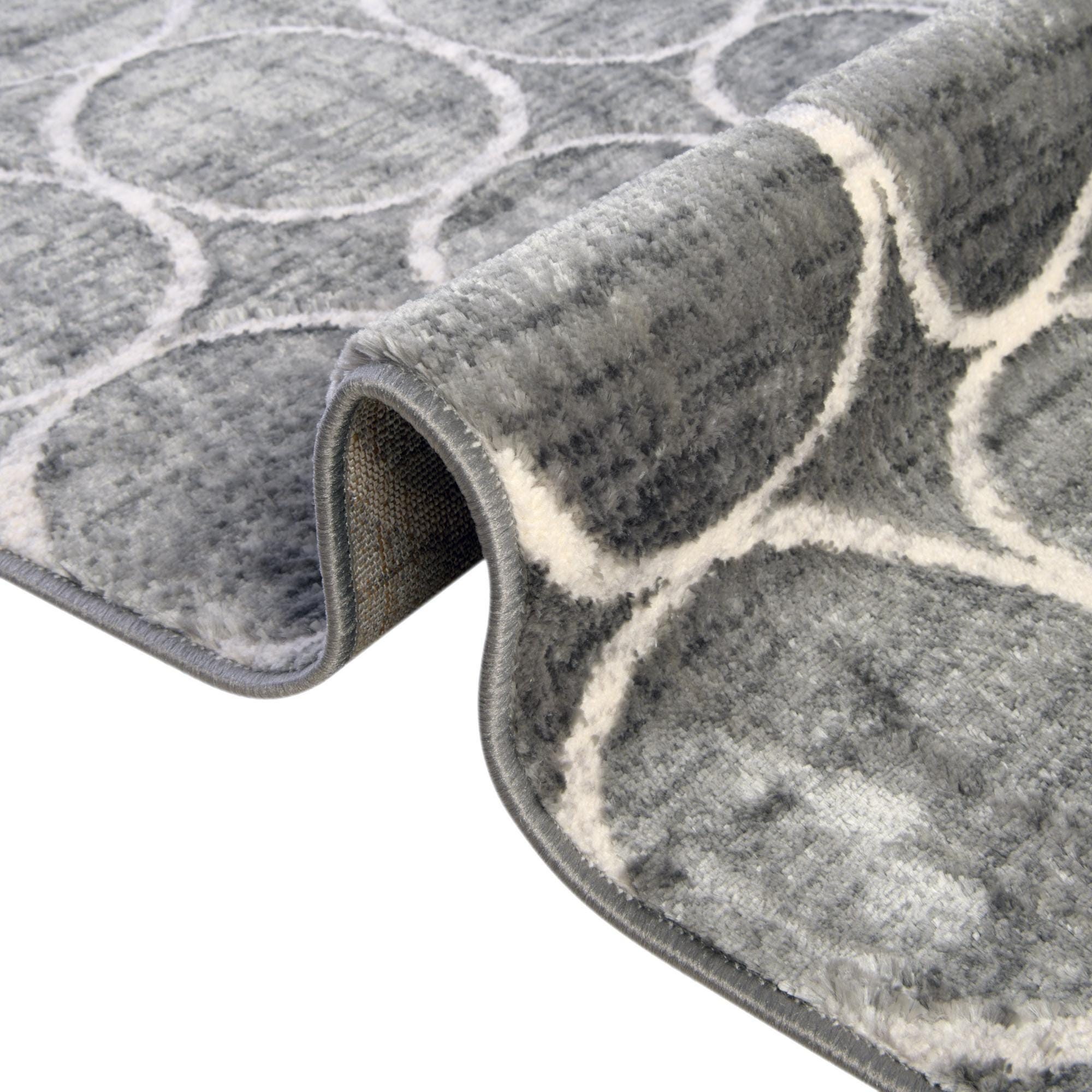 A 5x7 rectangular gray modern area rug featuring a repeating pattern of large white interlocking circles on a textured dark gray background.