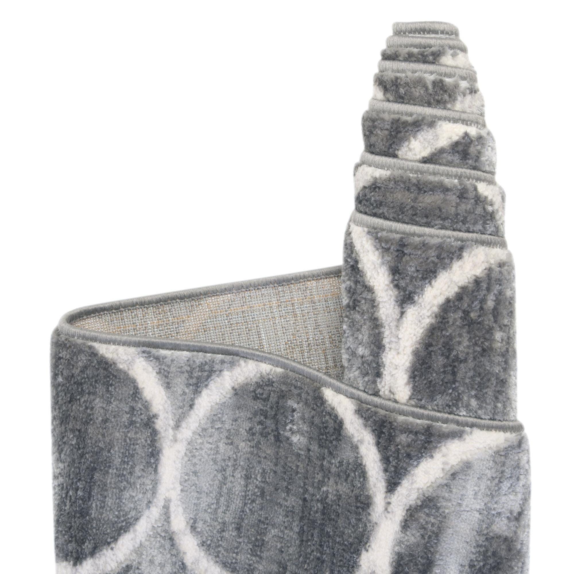 A contemporary geometric rug with a repeating grid of ivory circles set against a rich gray field. The raised ivory rings create gentle dimensionality and a softly plush contrast to the slightly textured gray background; you can feel the pattern underfoot as a subtle, comfortable pile variation. Machine-made from 100% polyester, the construction delivers clear pattern definition and a consistent hand across the surface.