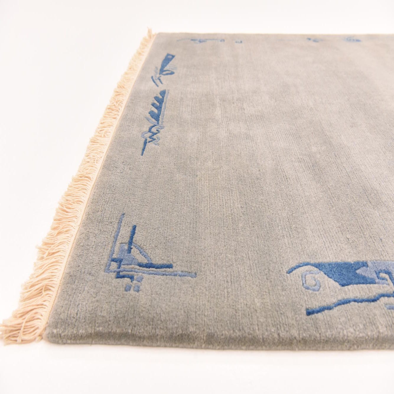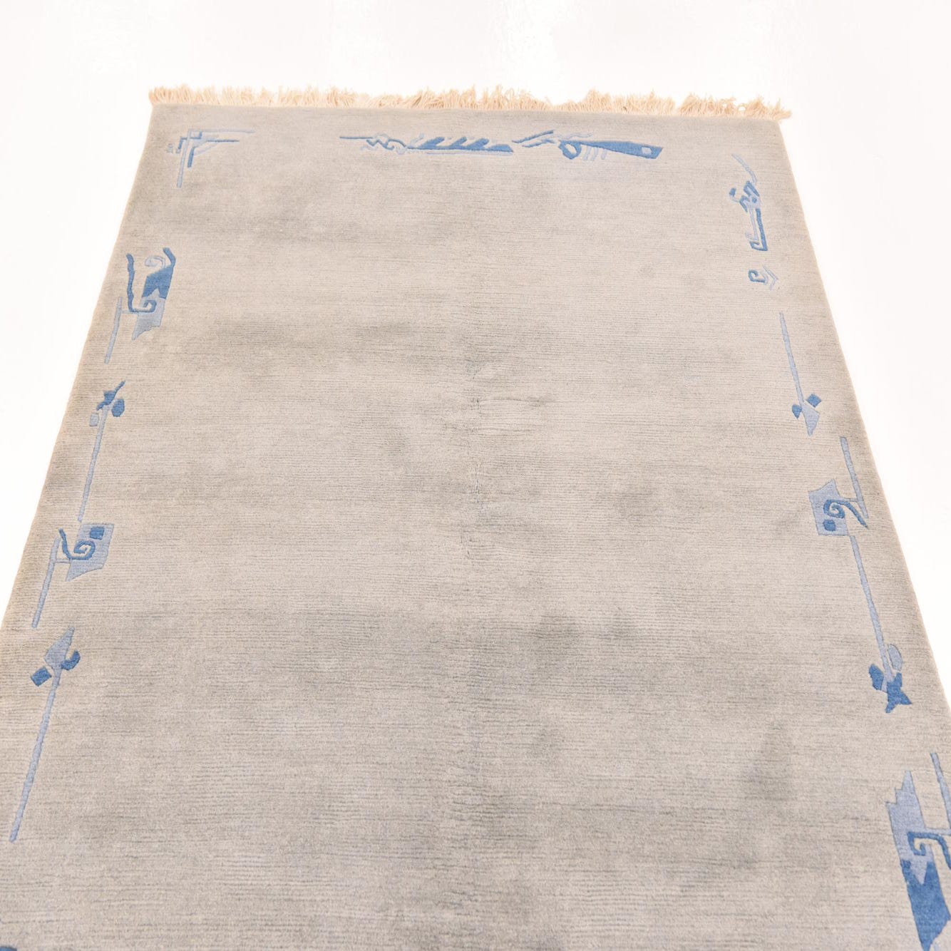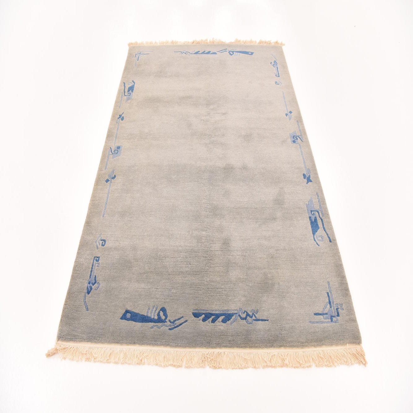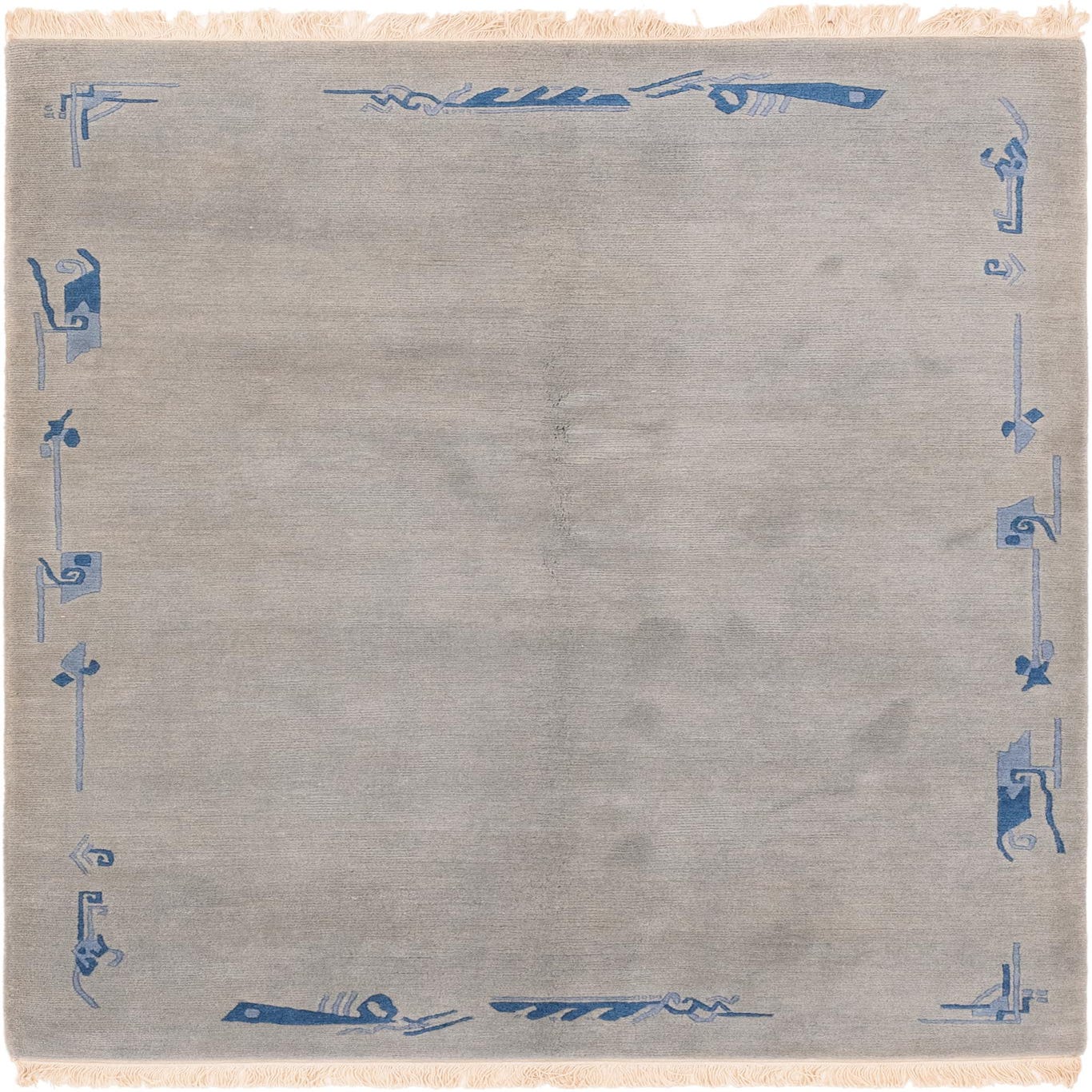 Hand-knotted from 100% wool, this rug presents a broad gray field with subtle tonal variation and a low, velvety pile that is soft to the touch. A restrained border of navy-blue abstract and linear motifs frames the edges and corners, adding a quiet graphic element without competing with surrounding furnishings. Short fringes on the ends and the slight hand-knotted irregularities add texture and visible depth when you run your hand across the surface.