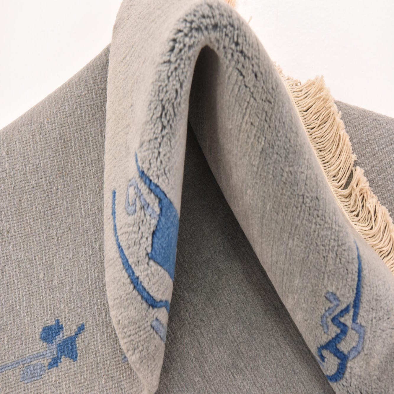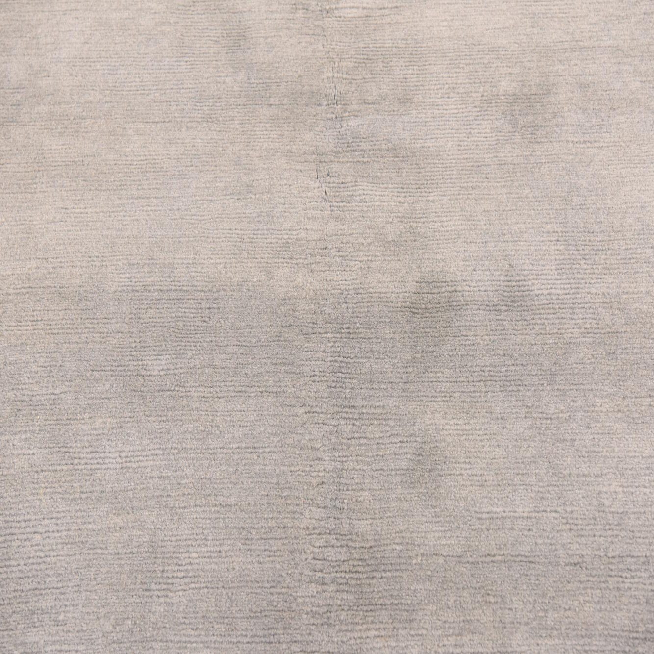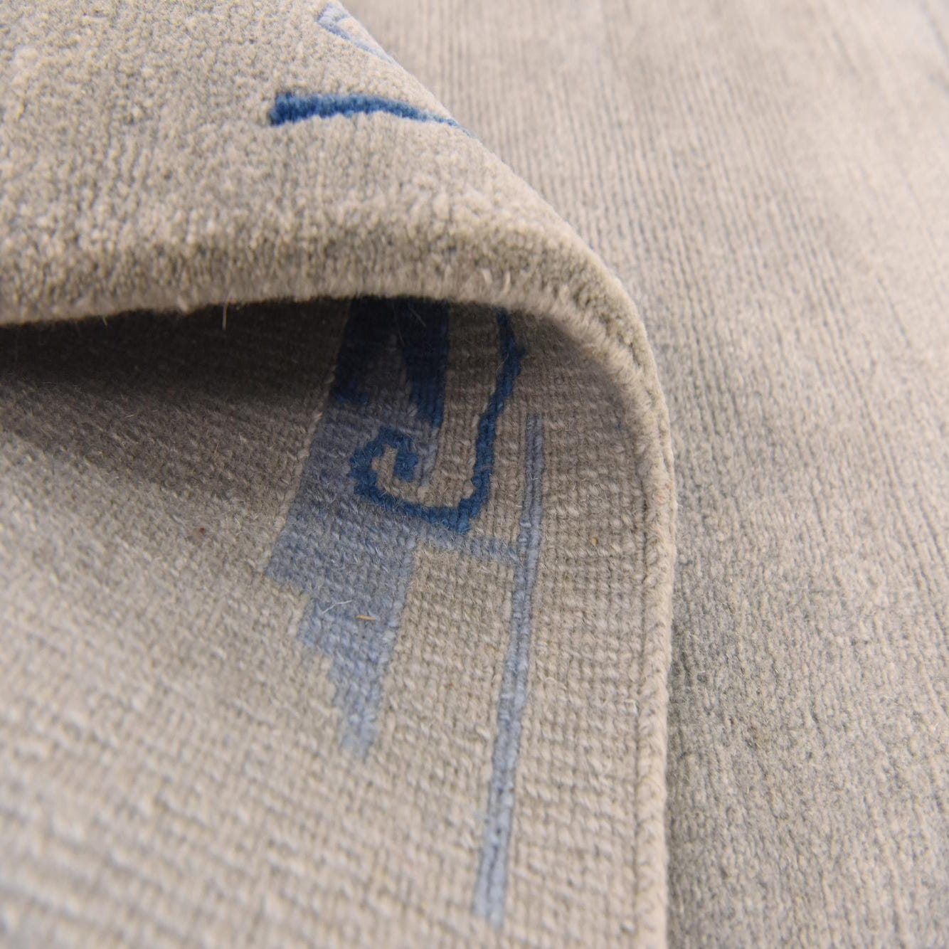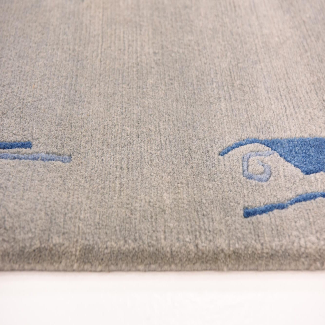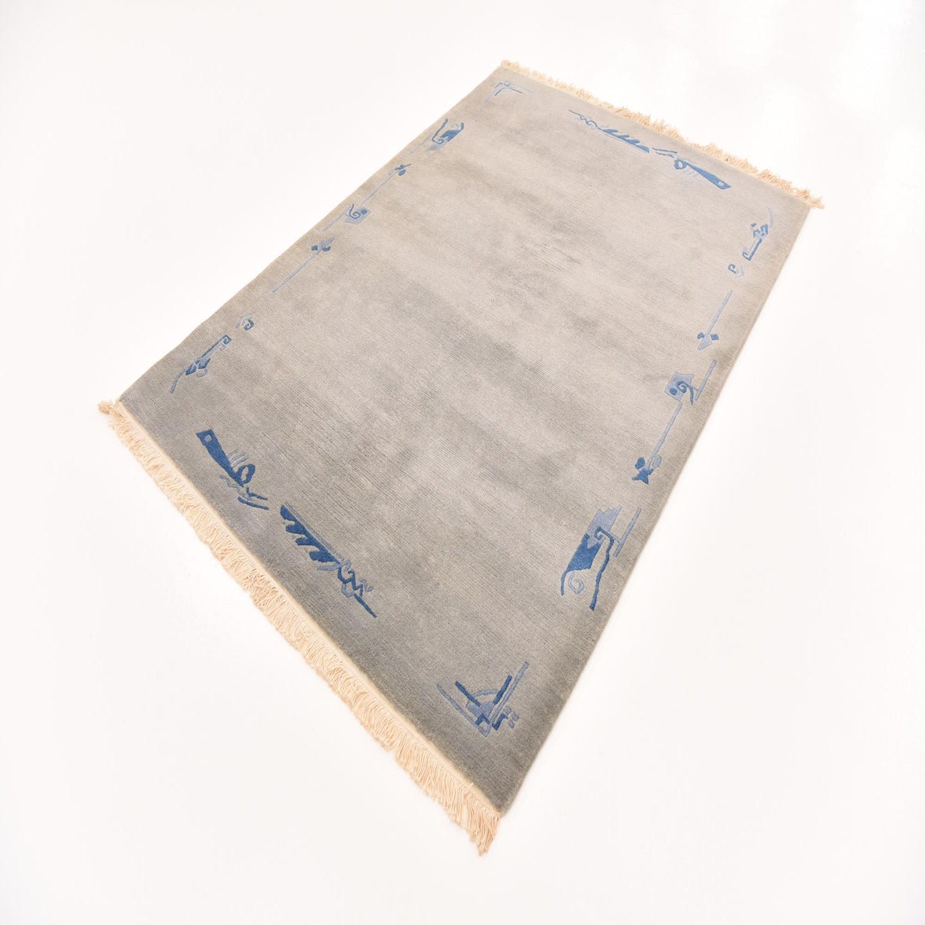 Hand-knotted from 100% wool, this rug presents a broad gray field with subtle tonal variation and a low, velvety pile that is soft to the touch. A restrained border of navy-blue abstract and linear motifs frames the edges and corners, adding a quiet graphic element without competing with surrounding furnishings. Short fringes on the ends and the slight hand-knotted irregularities add texture and visible depth when you run your hand across the surface.