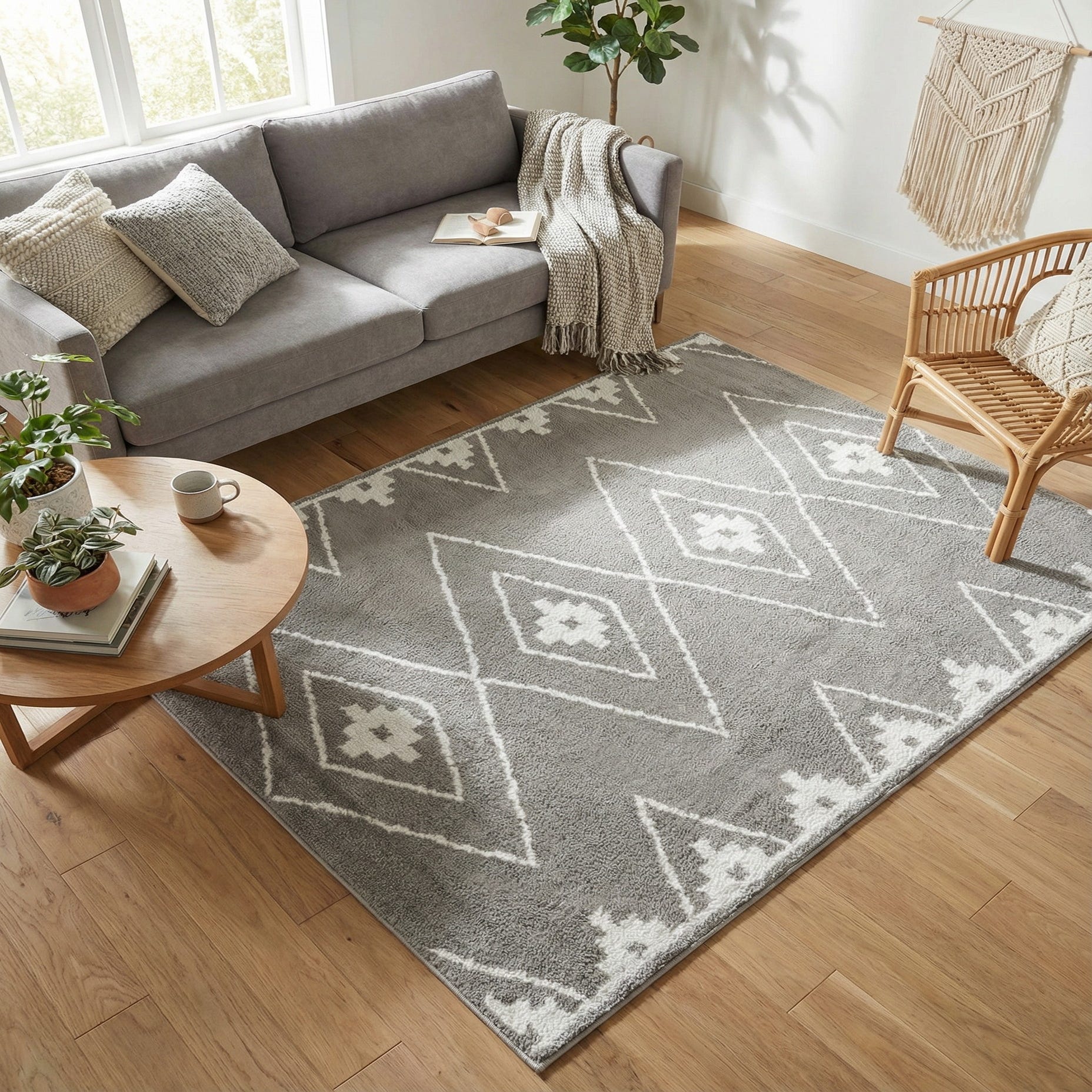 The neutral color palette of gray and ivory allows for seamless integration into various decor styles, from Scandinavian minimalism to modern farmhouse. It would particularly complement spaces with cool-toned furnishings or serve as a subtle backdrop in a brightly-colored room, allowing other decor elements to shine. Whether placed in a living room, home office, or bedroom, this rug is designed to bring a touch of contemporary elegance to the space.
