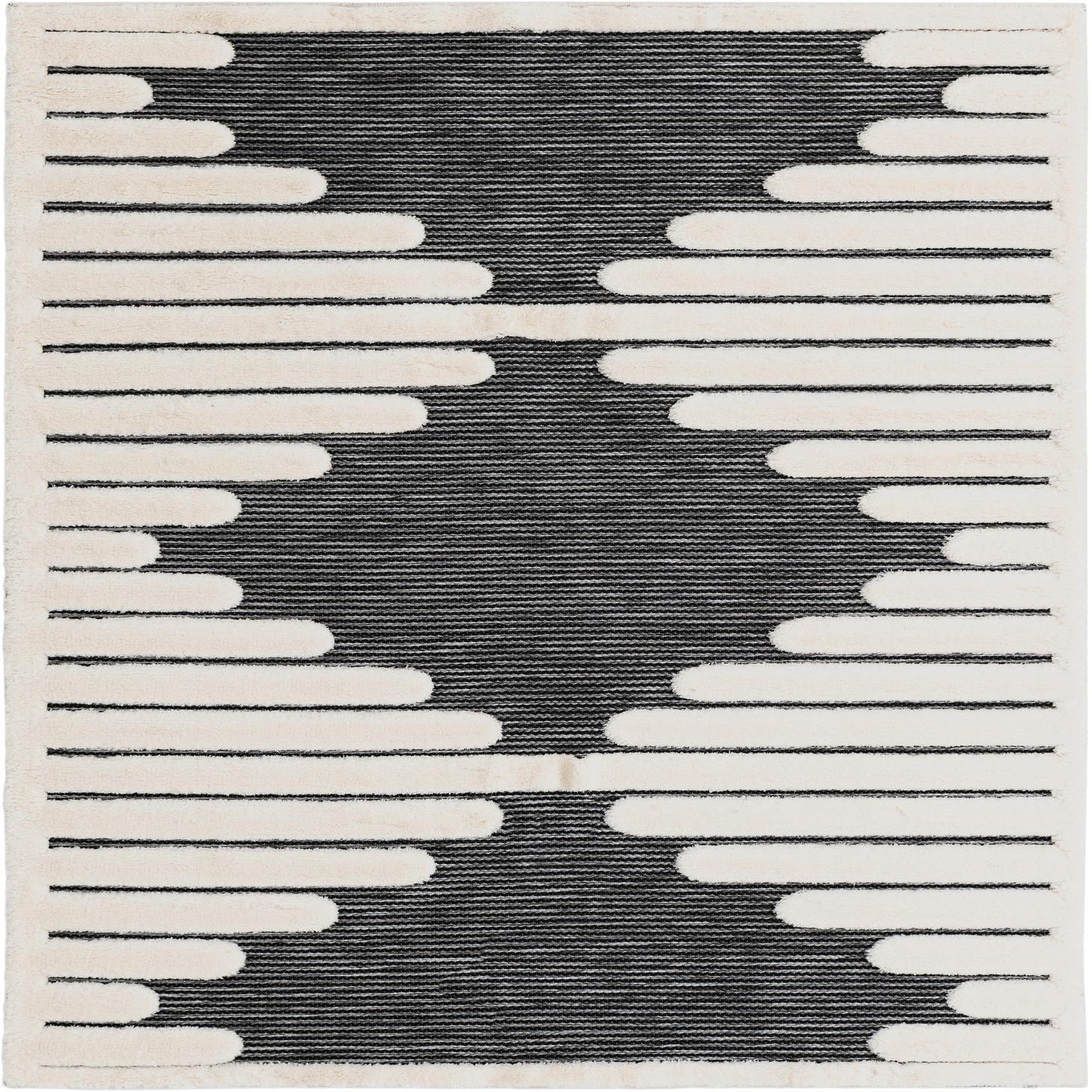 A 5x7 rectangular gray rug with a bold geometric pattern of raised ivory horizontal lines creating a central diamond shape.