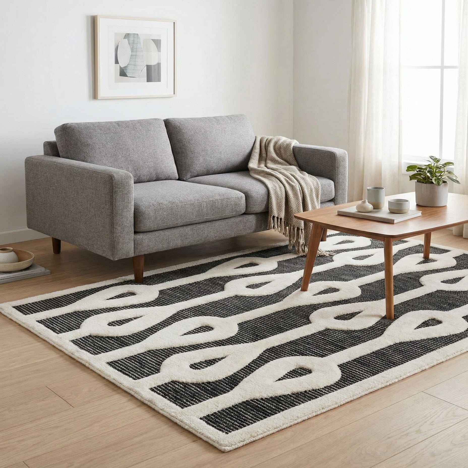 A 5x7 rectangular gray and white rug with a bold, modern geometric chain-link pattern, suitable for a contemporary living space.