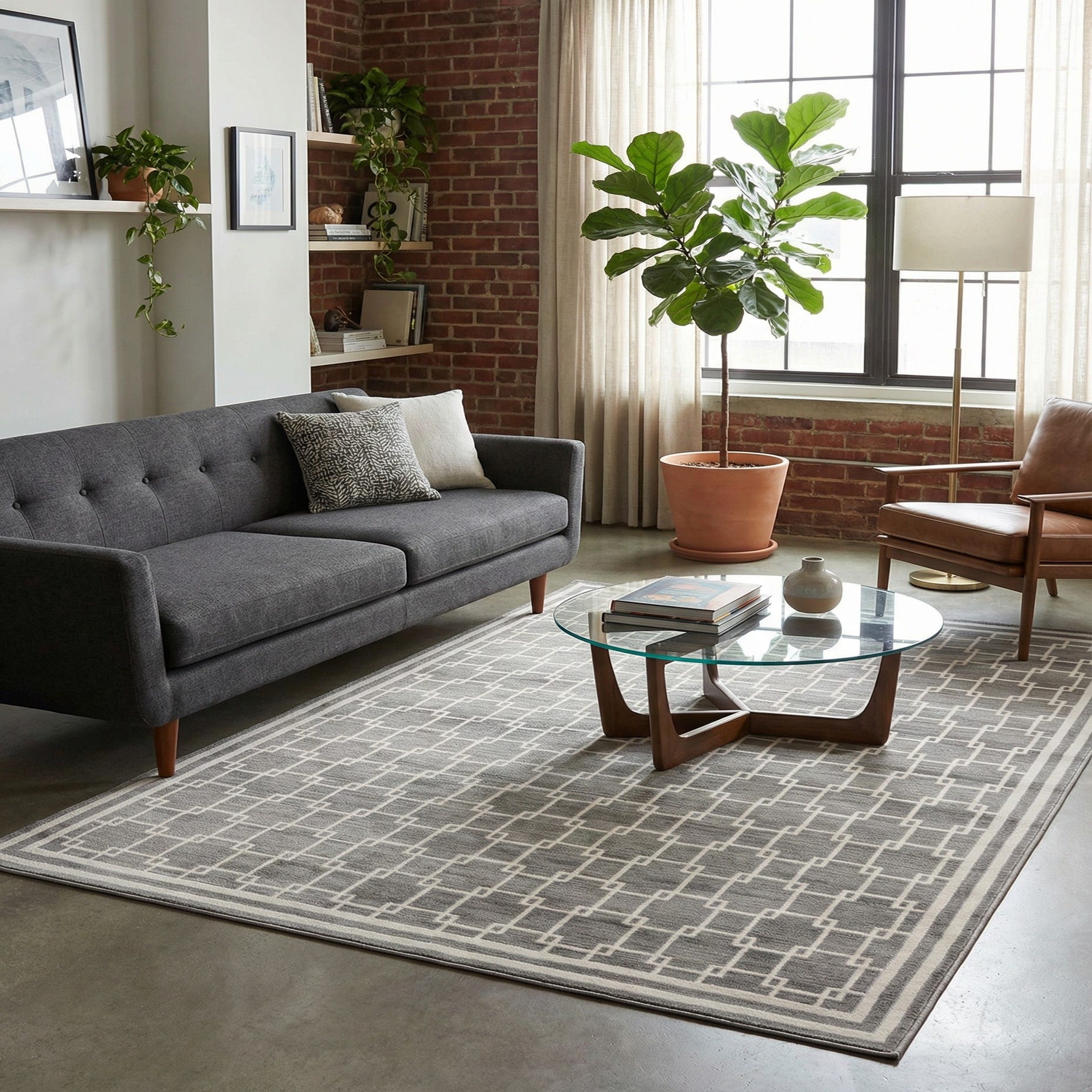 This neutral gray and ivory palette works well in contemporary and transitional spaces. Place it under a sofa and coffee table to anchor a living room, beneath a dining table to bring structured pattern to mealtime, or in a home office or entry to introduce clean lines without overpowering other furnishings. It pairs easily with wood finishes, metal accents, and cool-toned fabrics for a cohesive, layered interior.