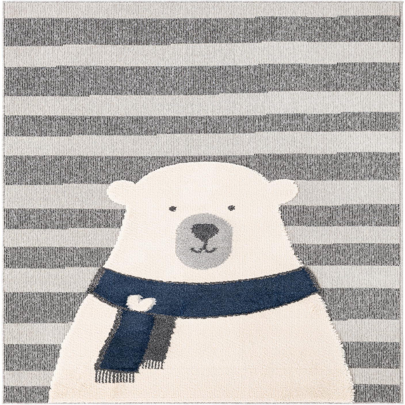 A rectangular 5x7 gray and white striped rug featuring a large, friendly white polar bear wearing a blue scarf, perfect for a child's room.