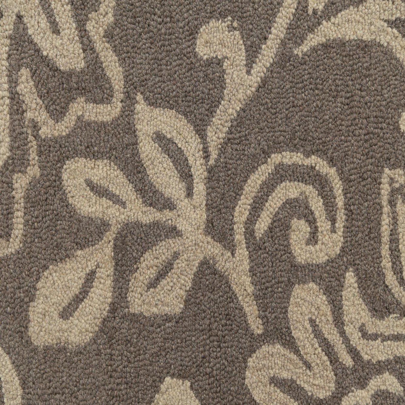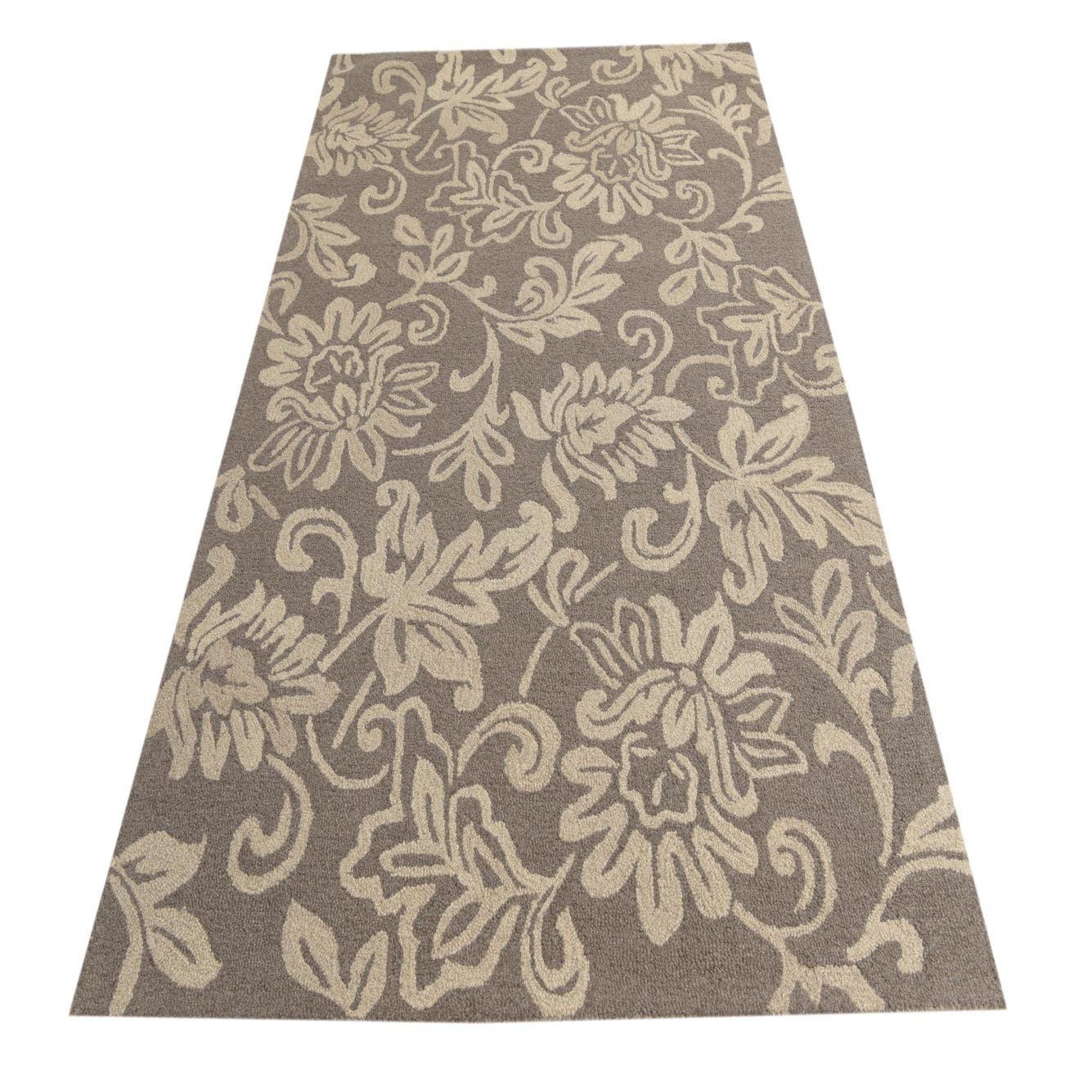 A 5x8 rectangular gray modern area rug with an intricate light beige floral and vine pattern, suitable for a living room.